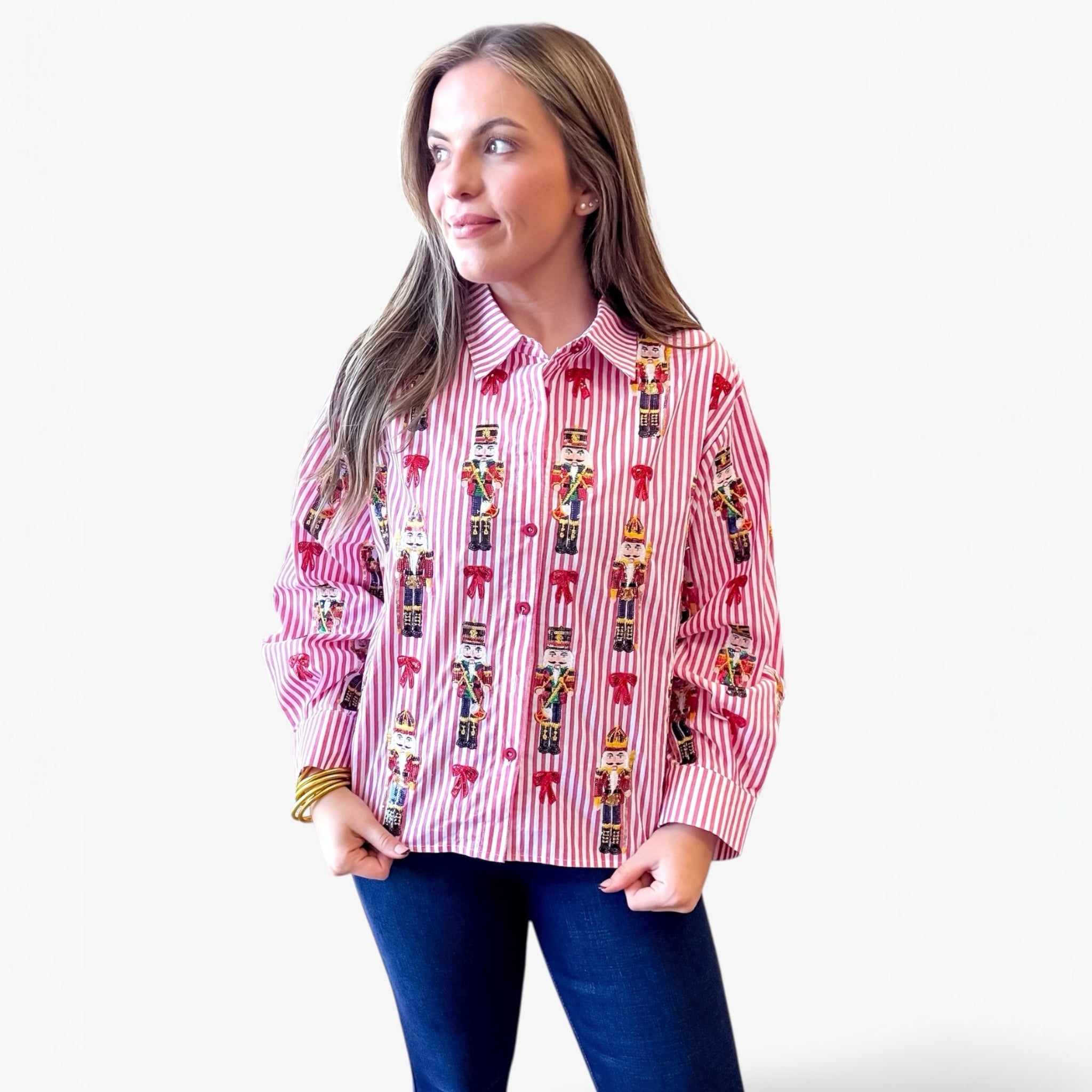 Playful holiday sparkle shines bright in this Queen of Sparkles Nutcracker & Bow Button Up Top featuring red and white stripes with dazzling sequin nutcrackers and festive bows.