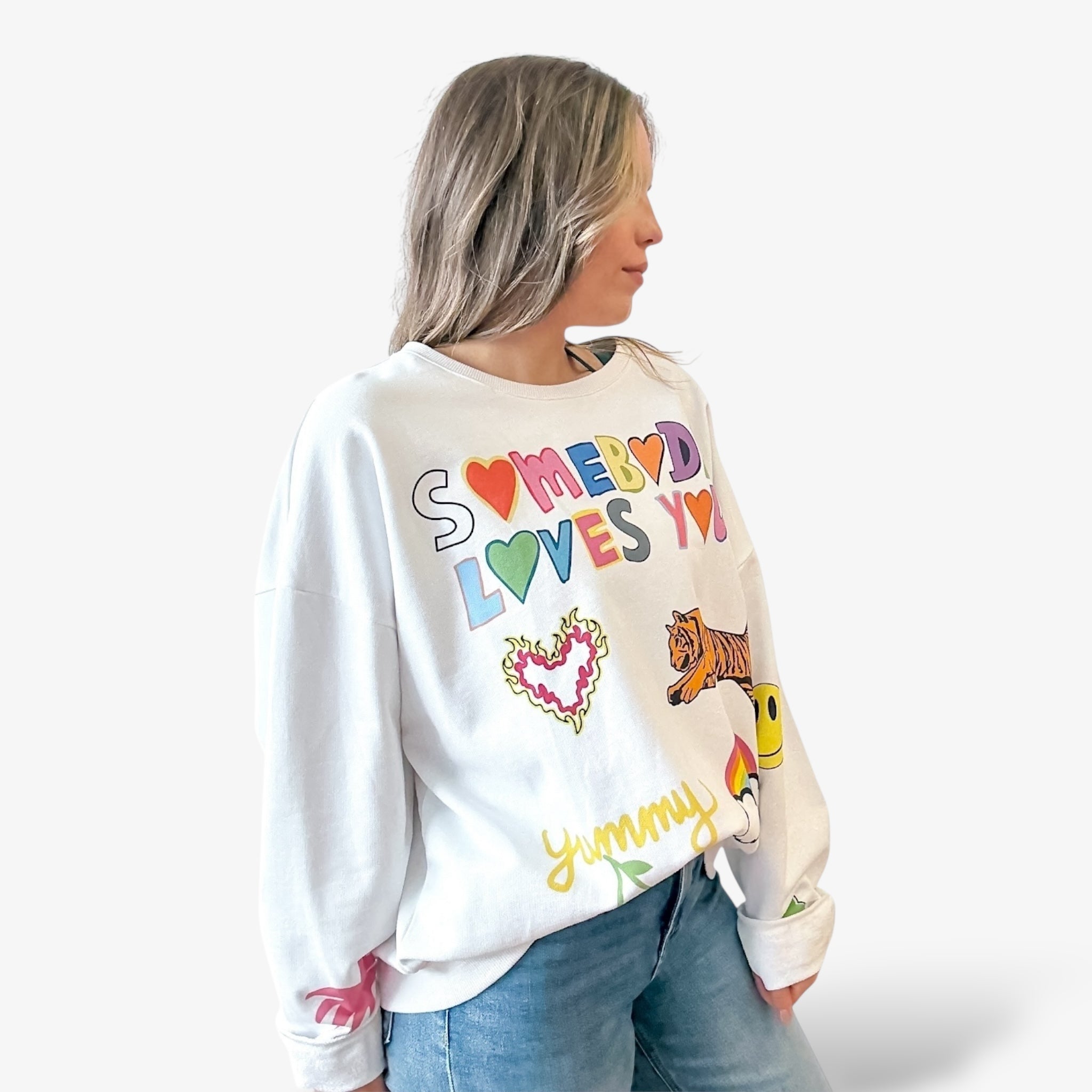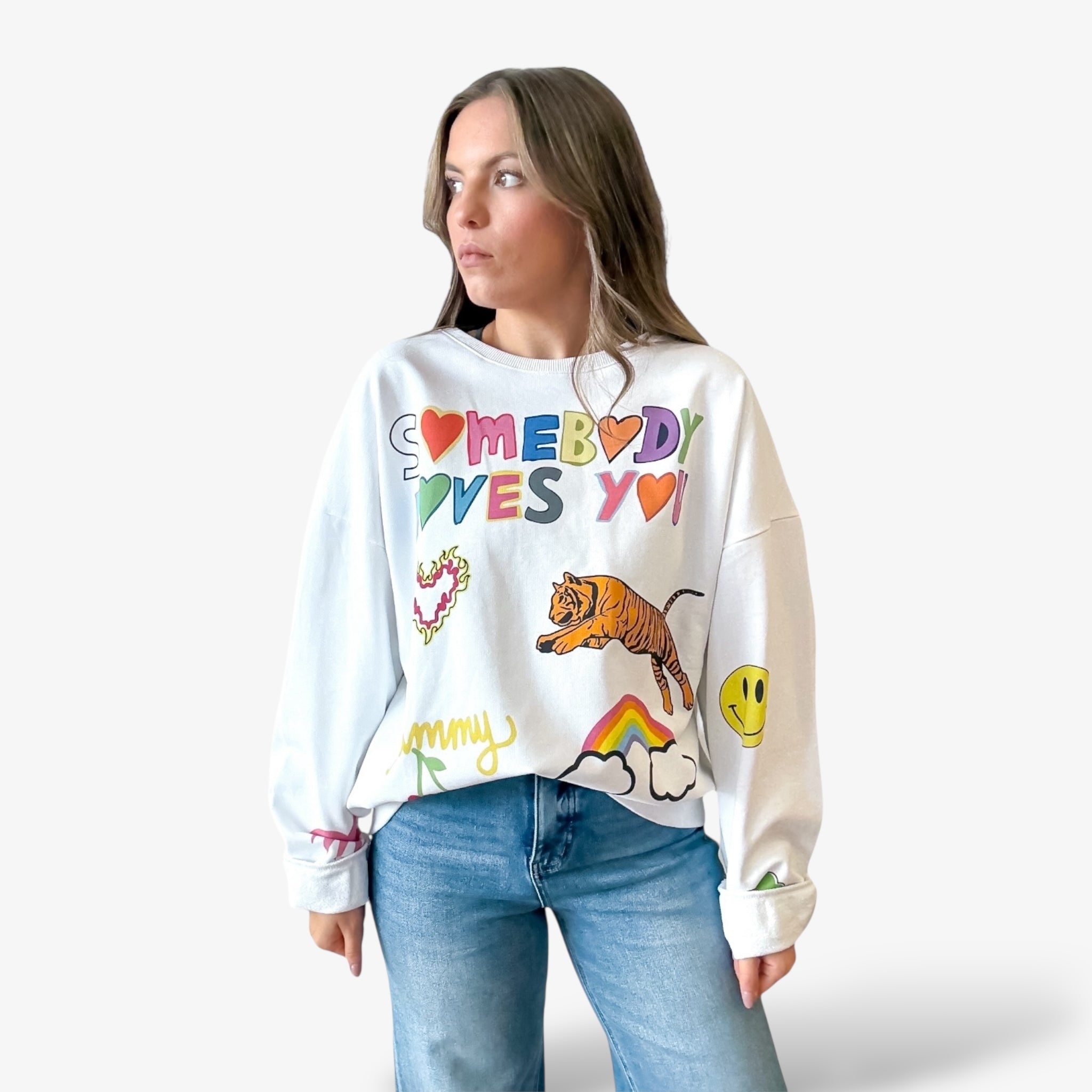 - Design: Front “Somebody Loves You” graphic with rainbow, tiger, and hearts