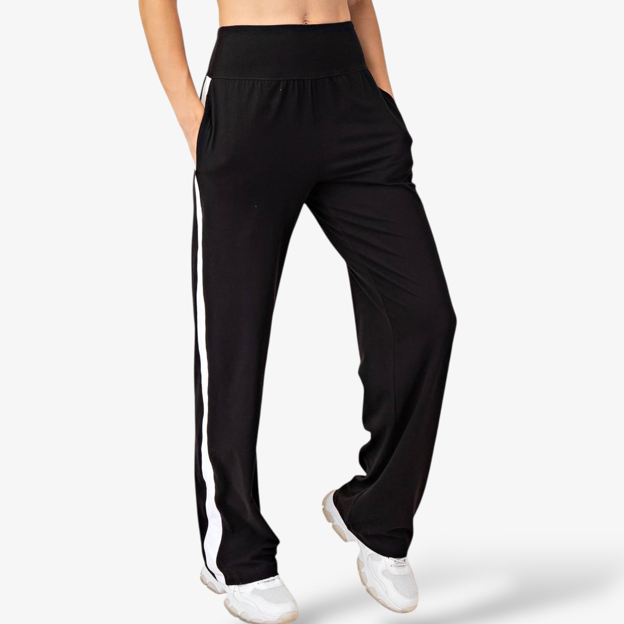 Velocity Stripe Pant in black with white side stripe, designed for all-day comfort and chic athleisure style.