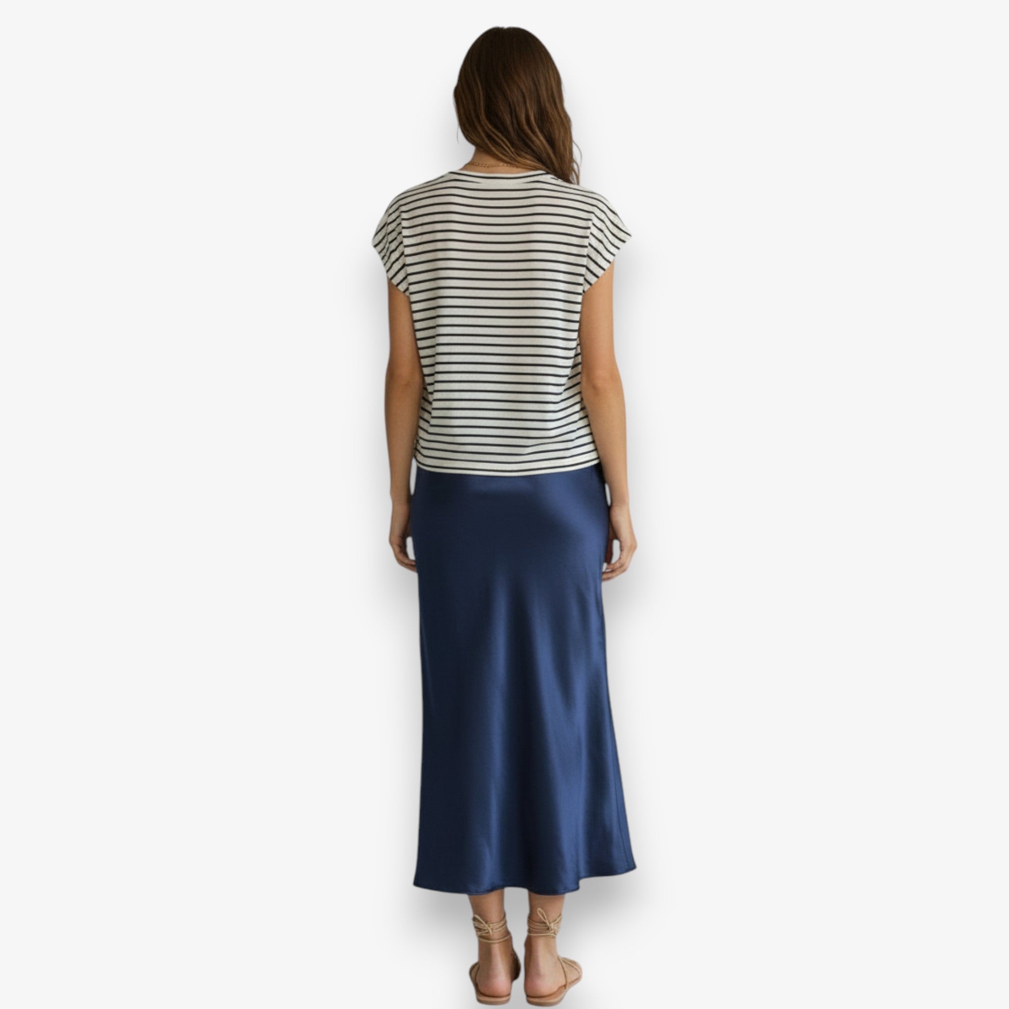 Sleek, timeless slip skirt with a smooth satin finish delivers effortless elegance in navy for endless styling versatility.