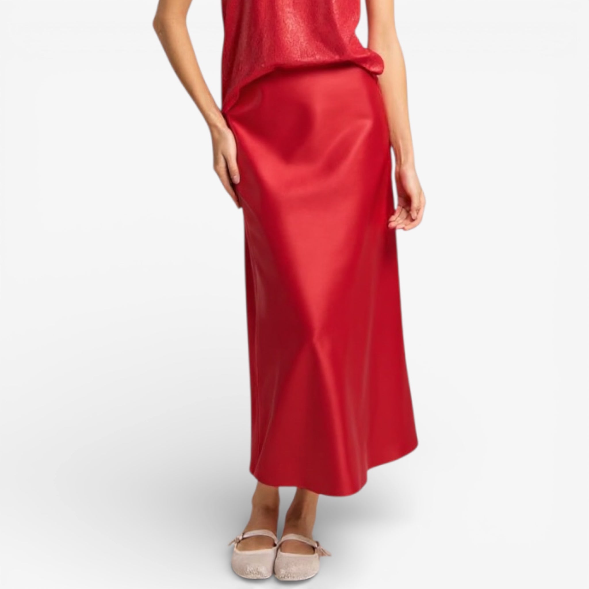 Red satin slip skirt designed with a smooth, fluid drape that hugs just right and instantly elevates tees, knits, and dressy tops.