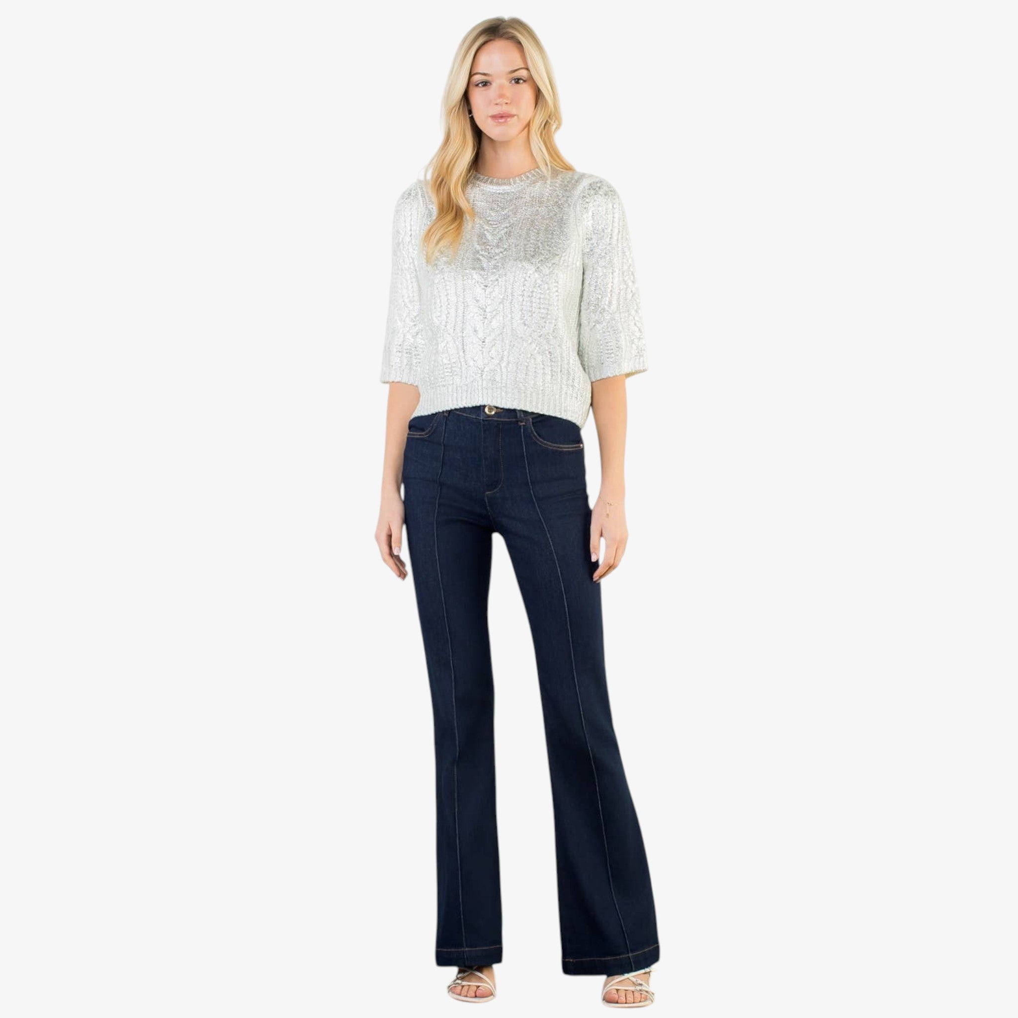 Metallic cable knit sweater delivers a polished, timeless look with soft texture and an easy silhouette that works from everyday wear to dressed-up moments.