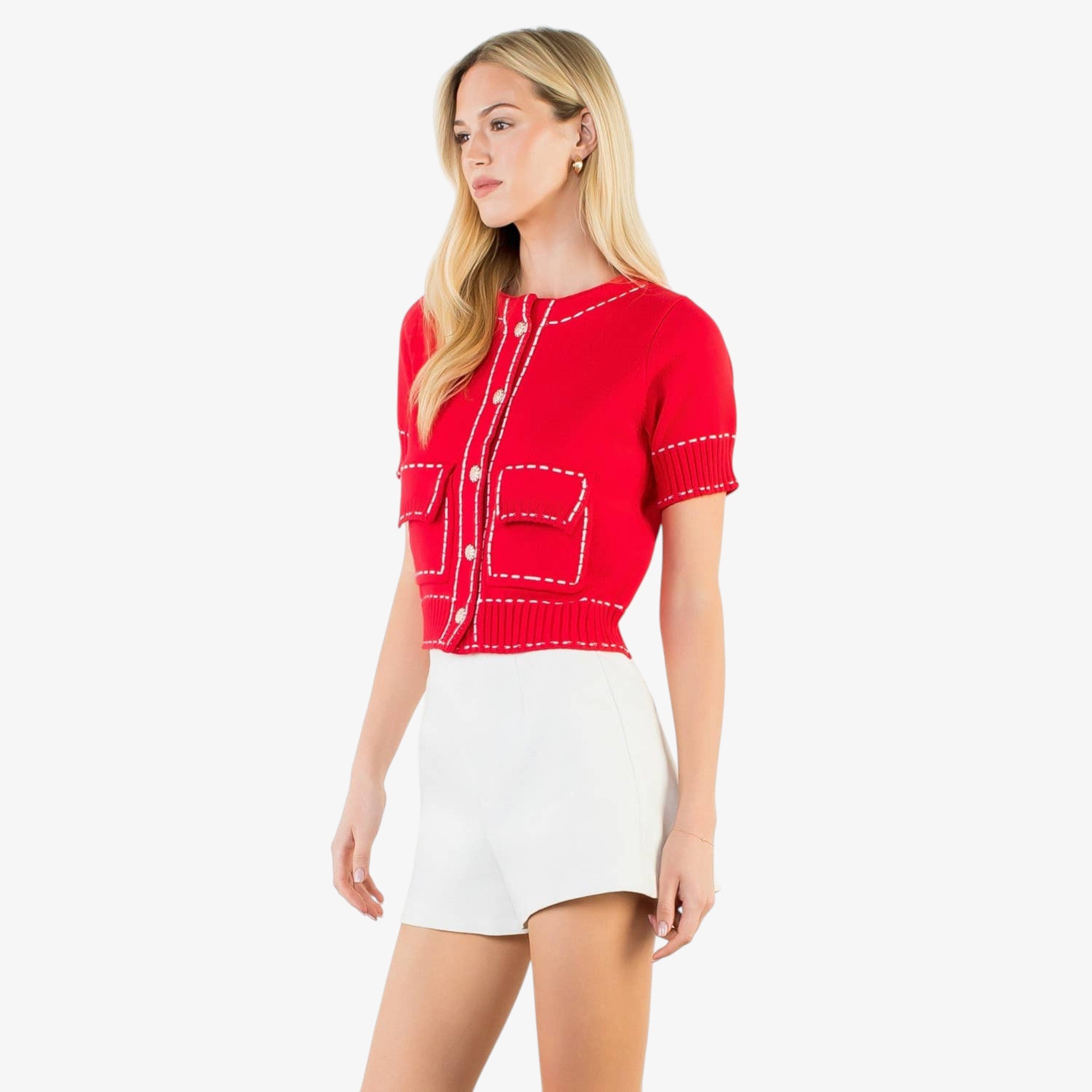 Red knit button up top featuring contrast white stitching and jeweled buttons for a polished yet playful boutique look.