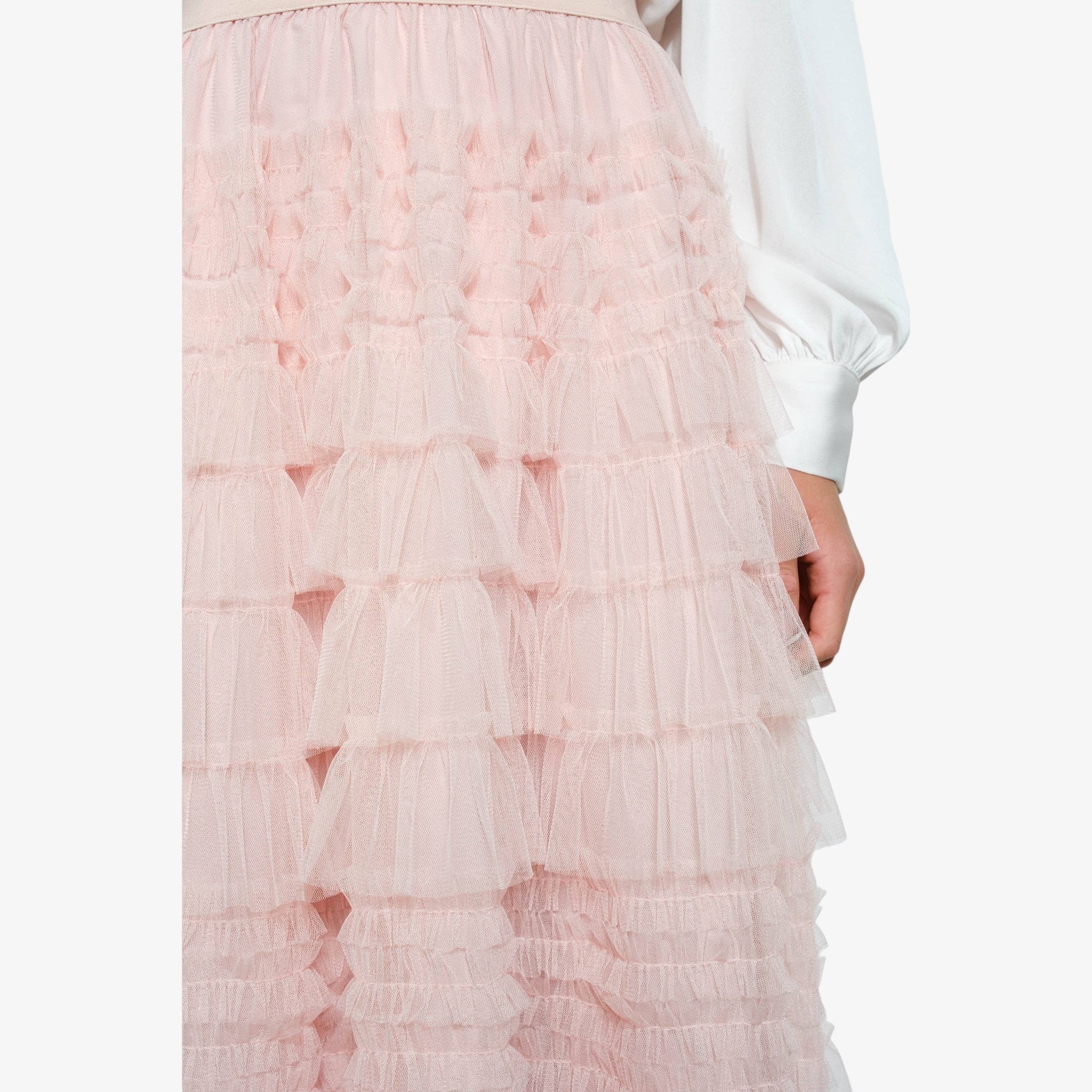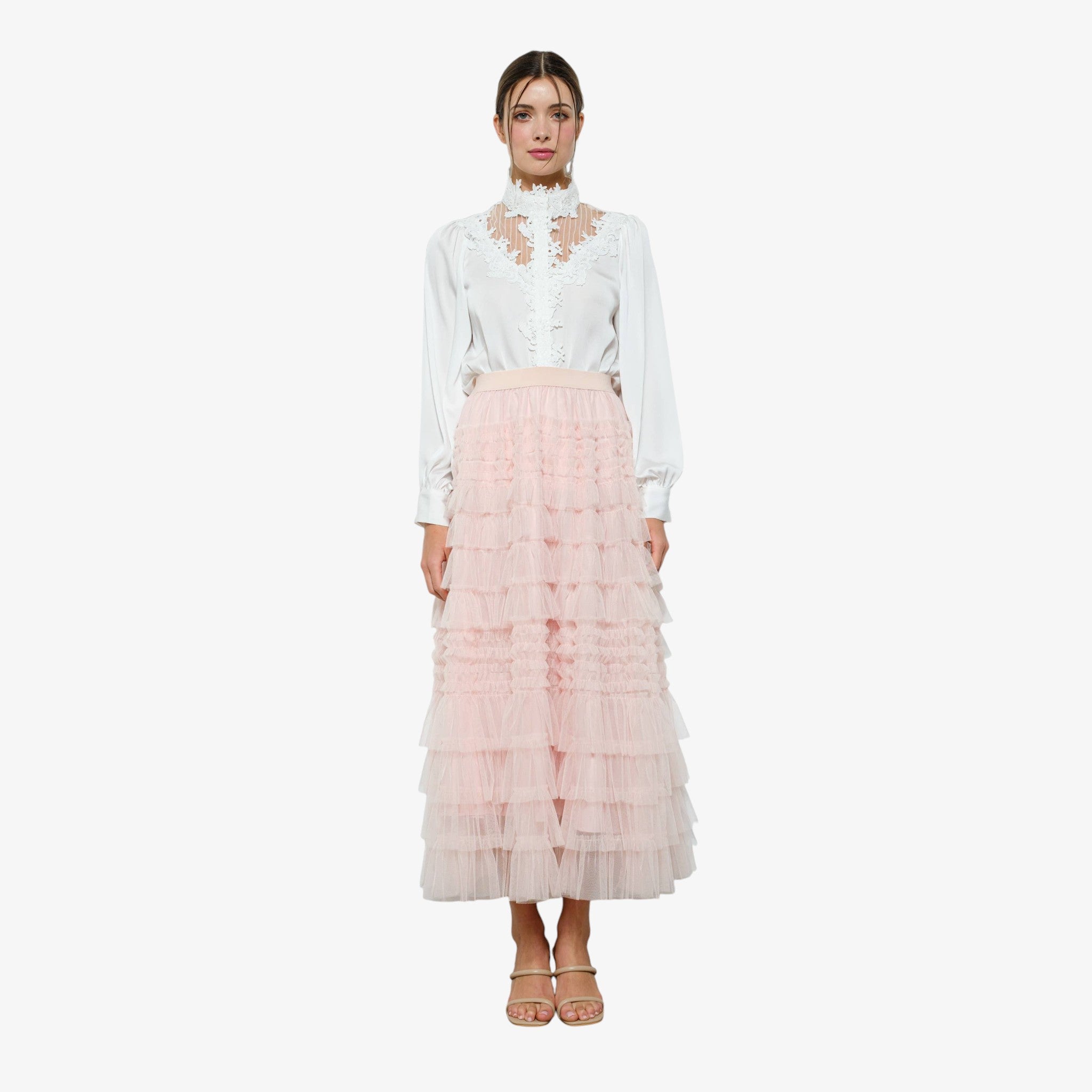 Romantic layered tulle maxi skirt designed with soft cascading tiers for an elegant, feminine statement look.