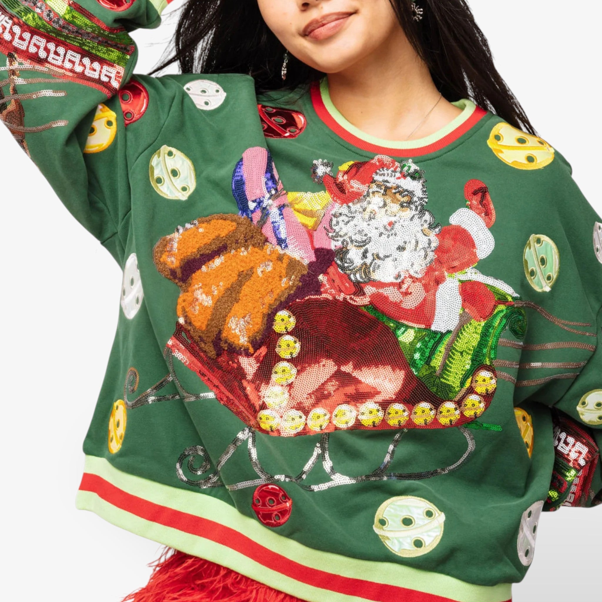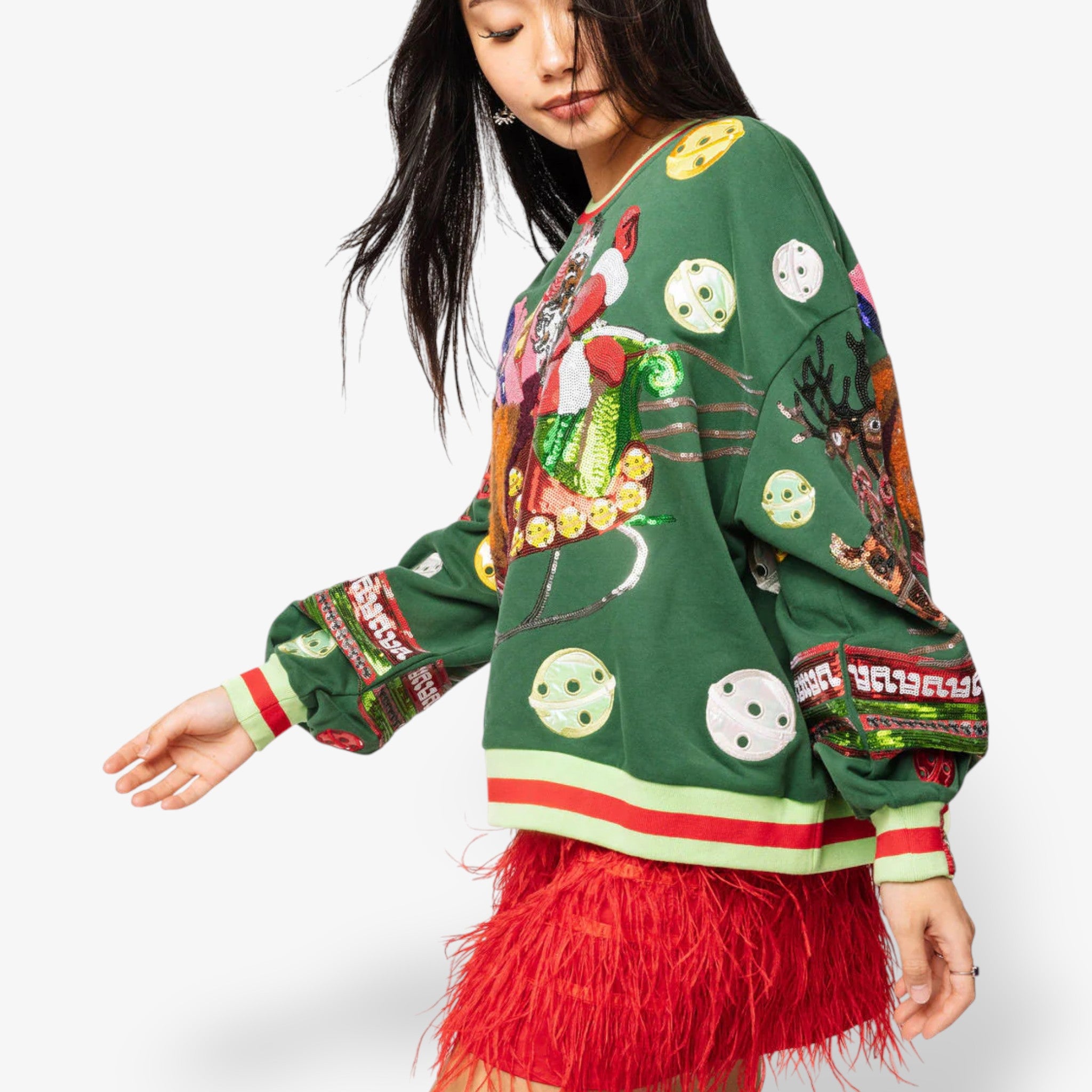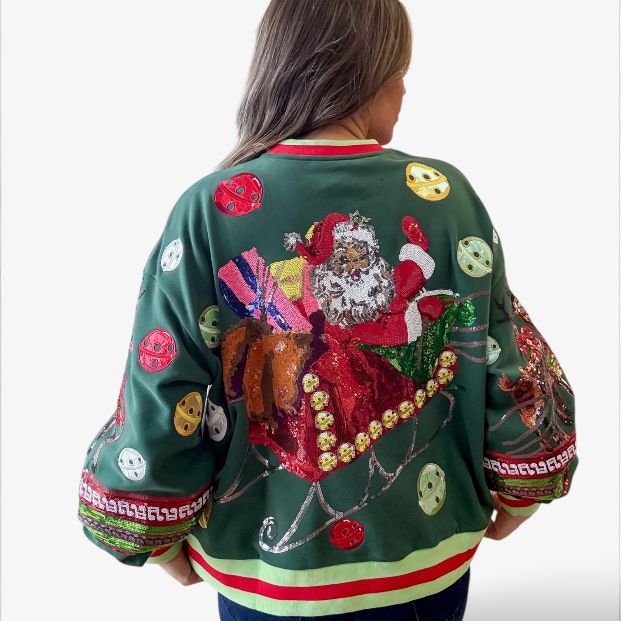 Festive green sequin sweatshirt featuring Santa in his sleigh with bold ornament detailing and bright trim for a vintage holiday sparkle look.