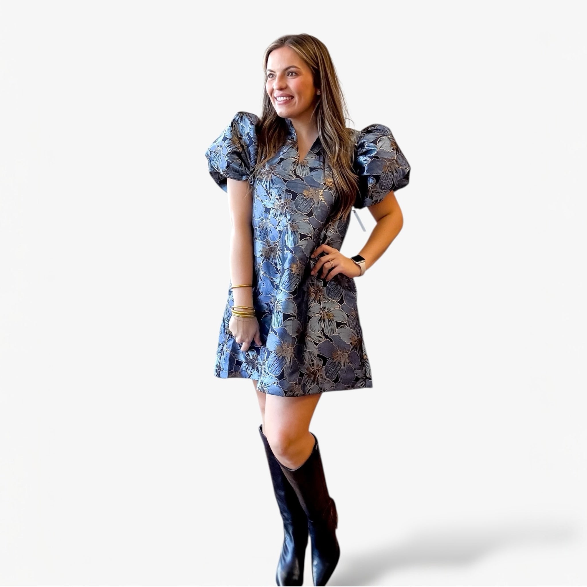 Metallic floral mini dress with dramatic puff sleeves and a luxe jacquard finish for standout style.