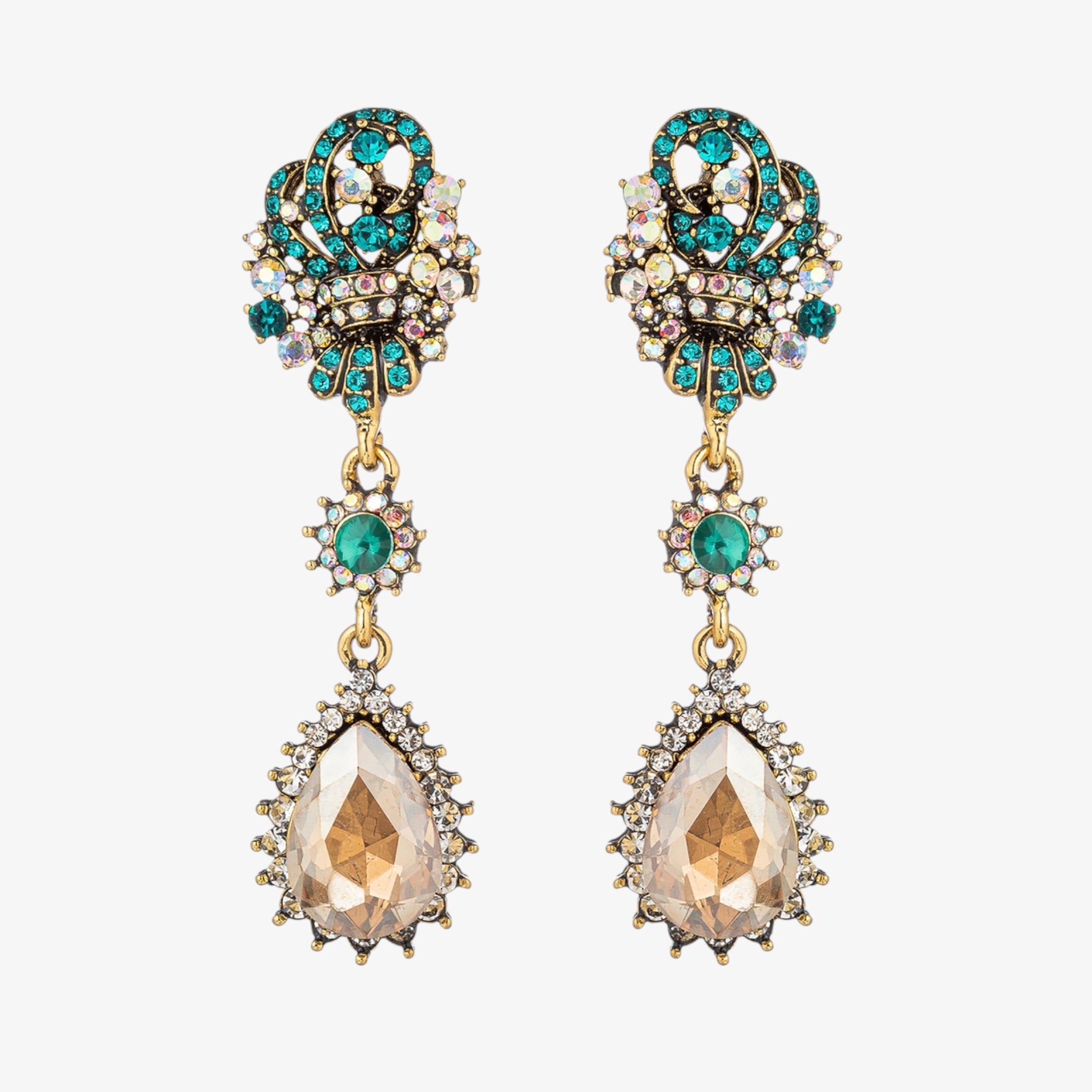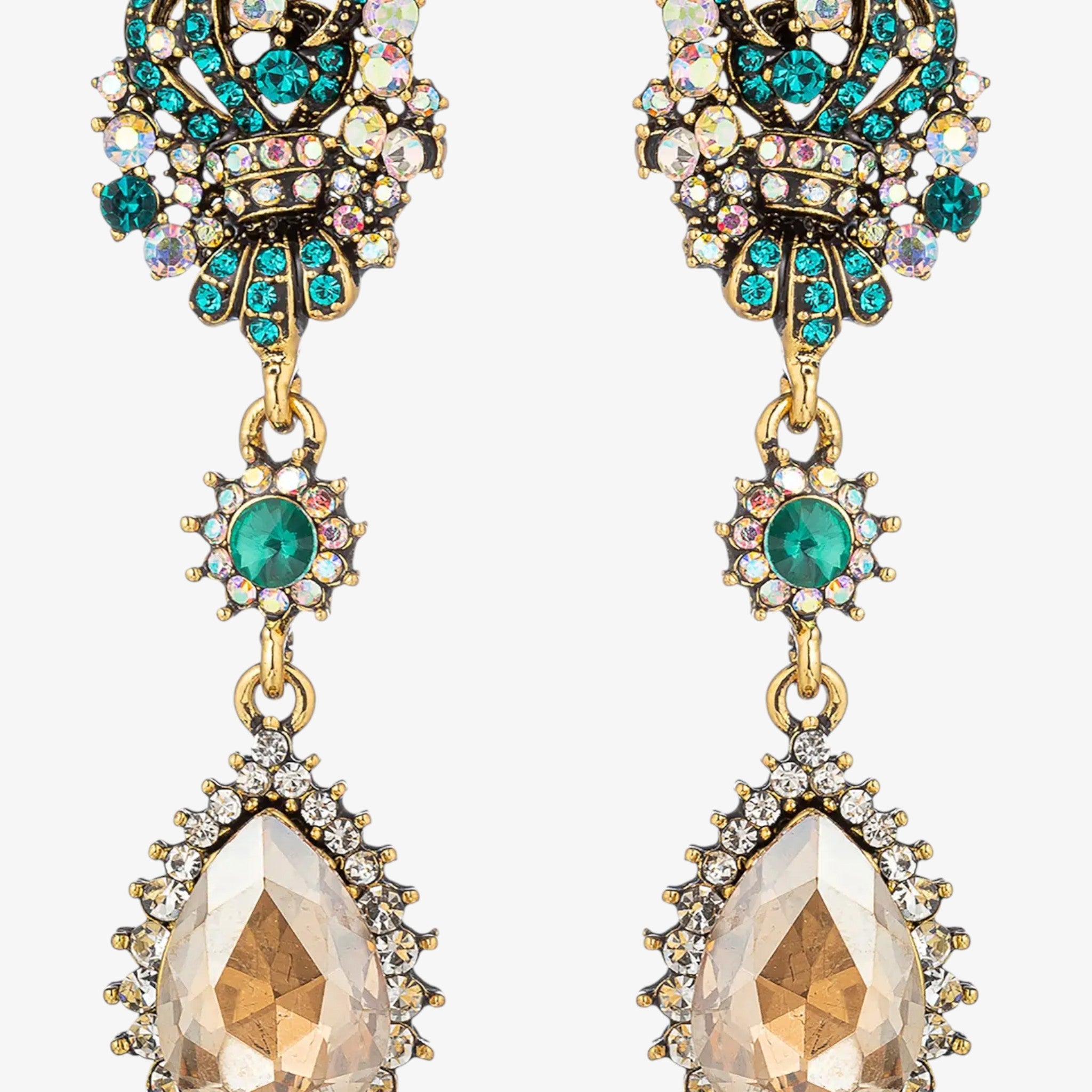 - Stone: Clear crystals, emerald-green crystal accents, faceted teardrop crystal