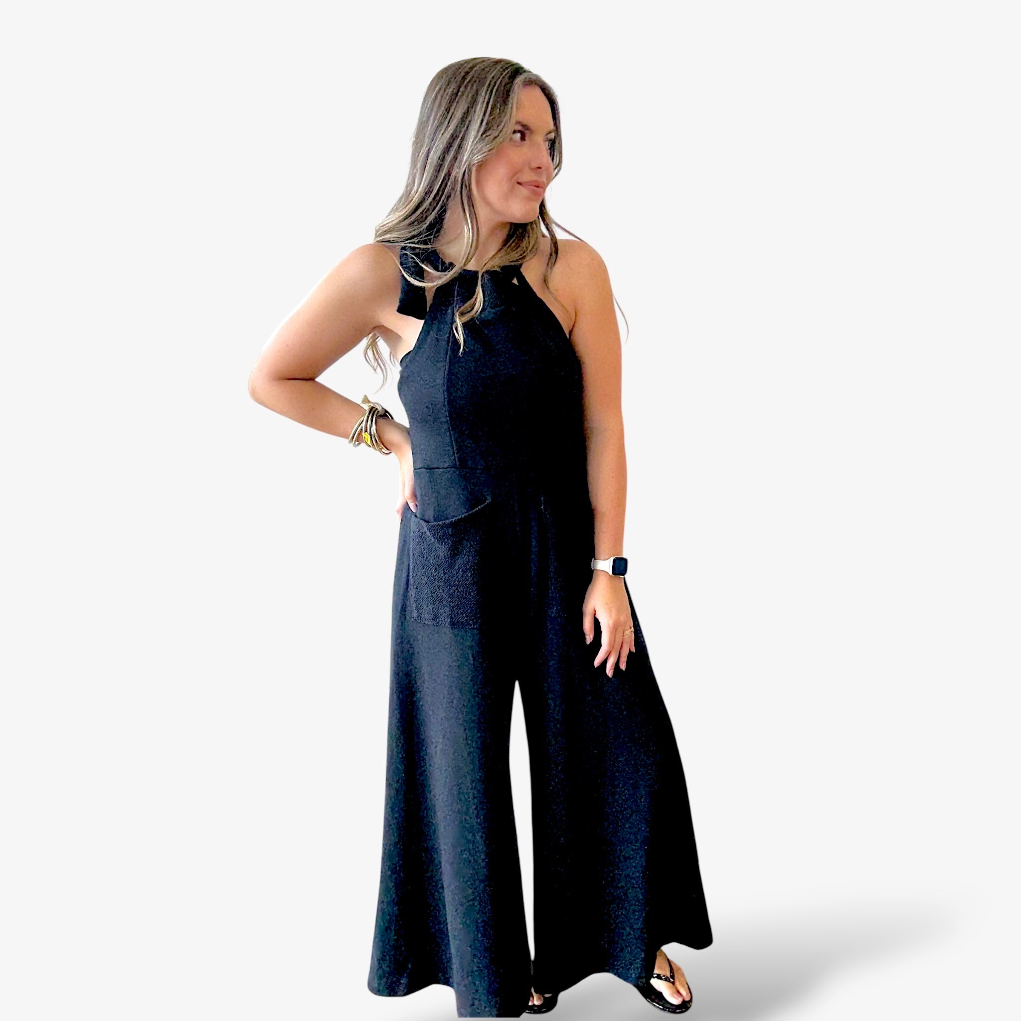 Flowy black wide leg overall jumpsuit with adjustable tie straps and oversized pockets for an effortlessly boho-chic look.