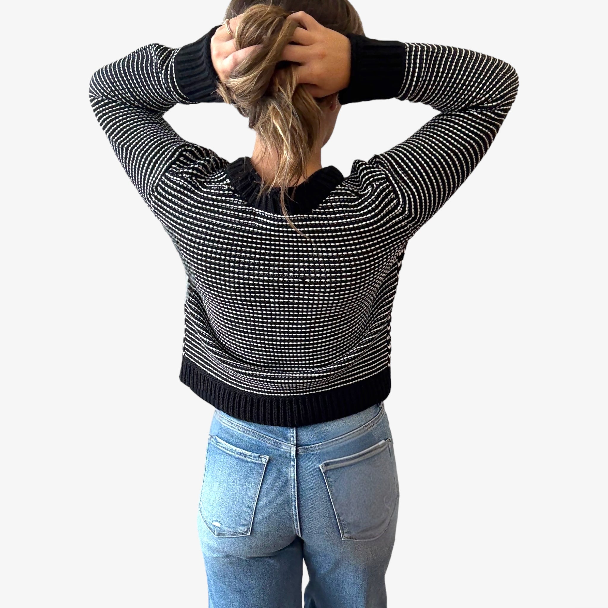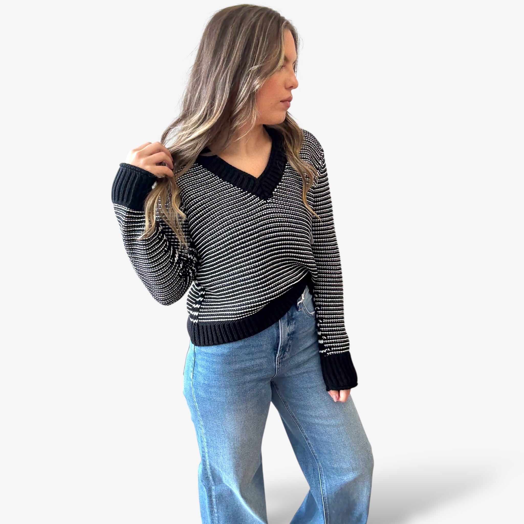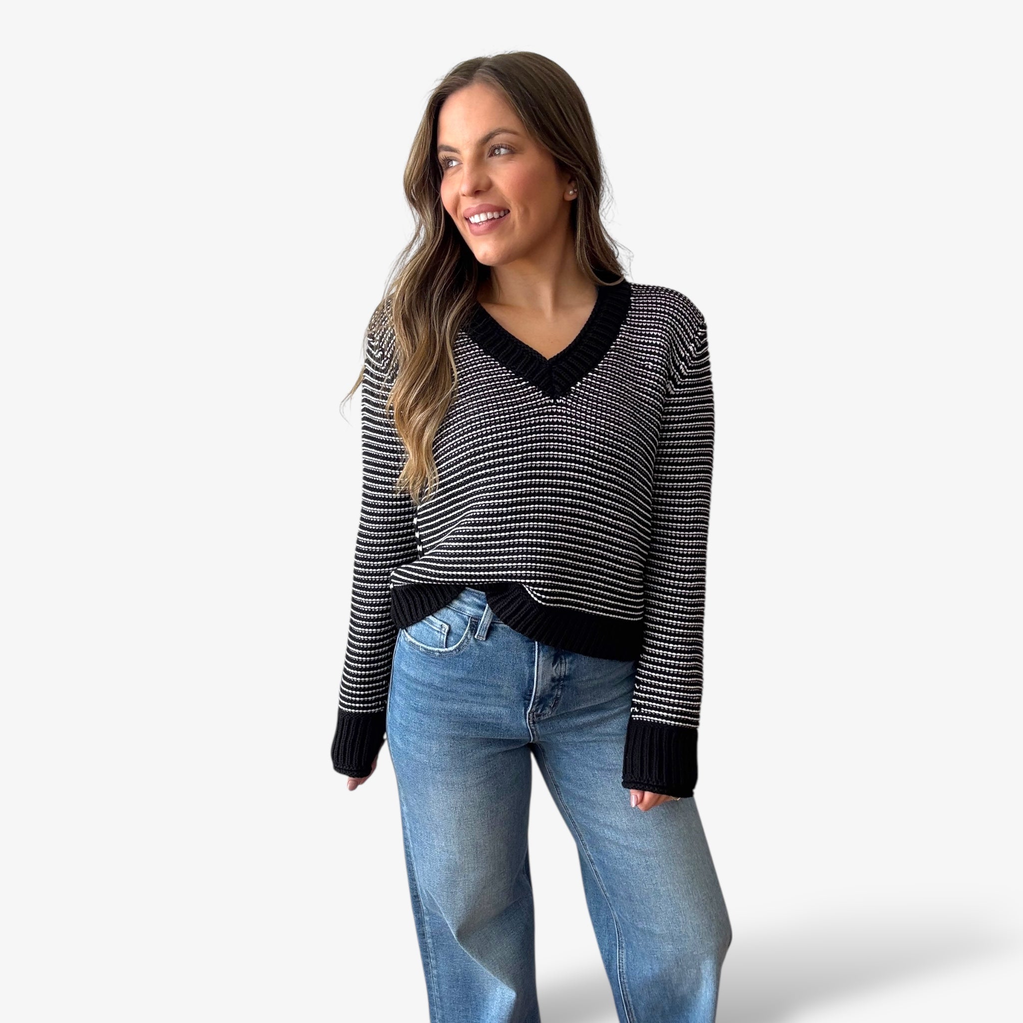 Soft ribbed knit V-neck pullover with a relaxed, cozy fit in classic Black and Ivory.