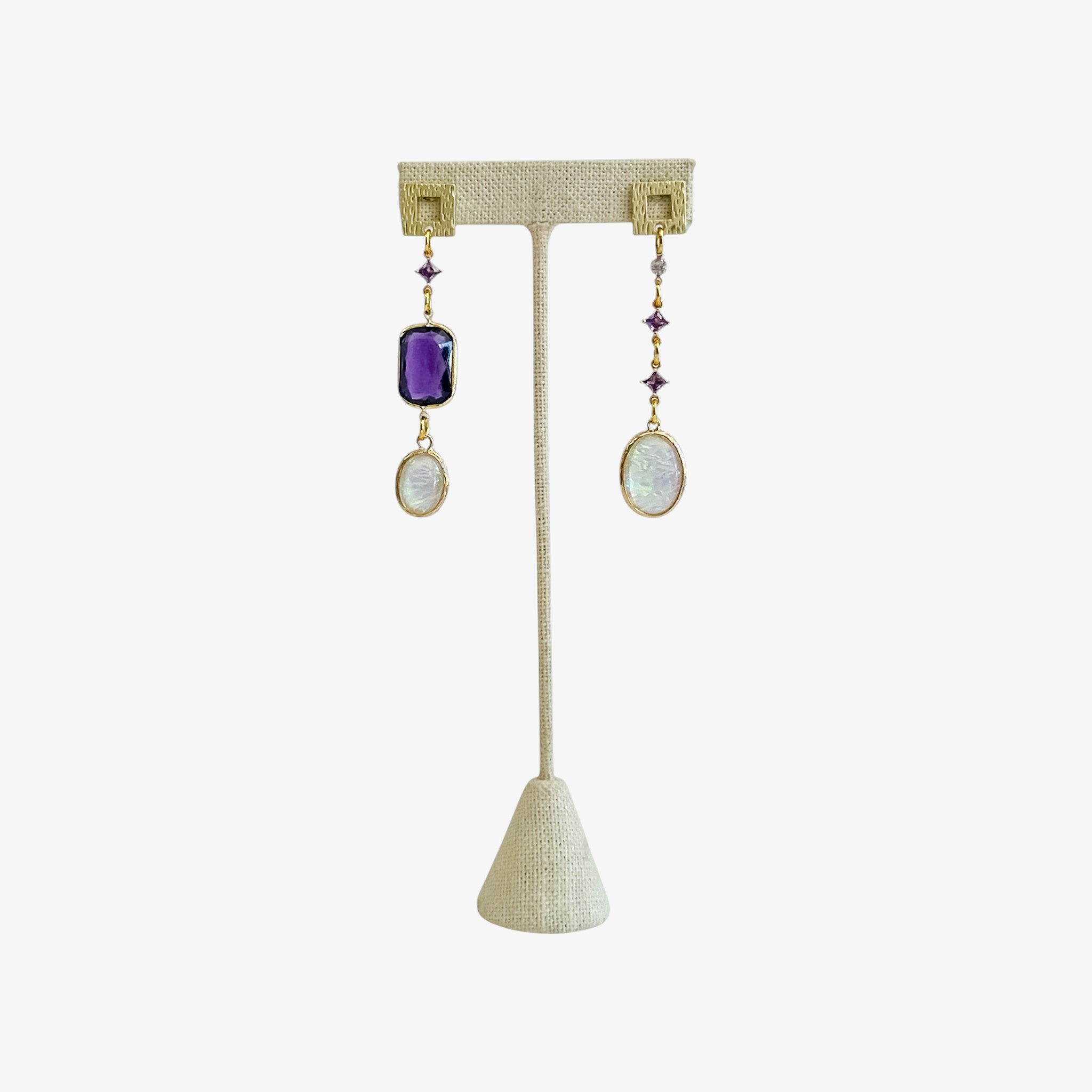Chic mismatched earrings featuring amethyst and iridescent stones with gold detailing for an elegant yet artistic touch.