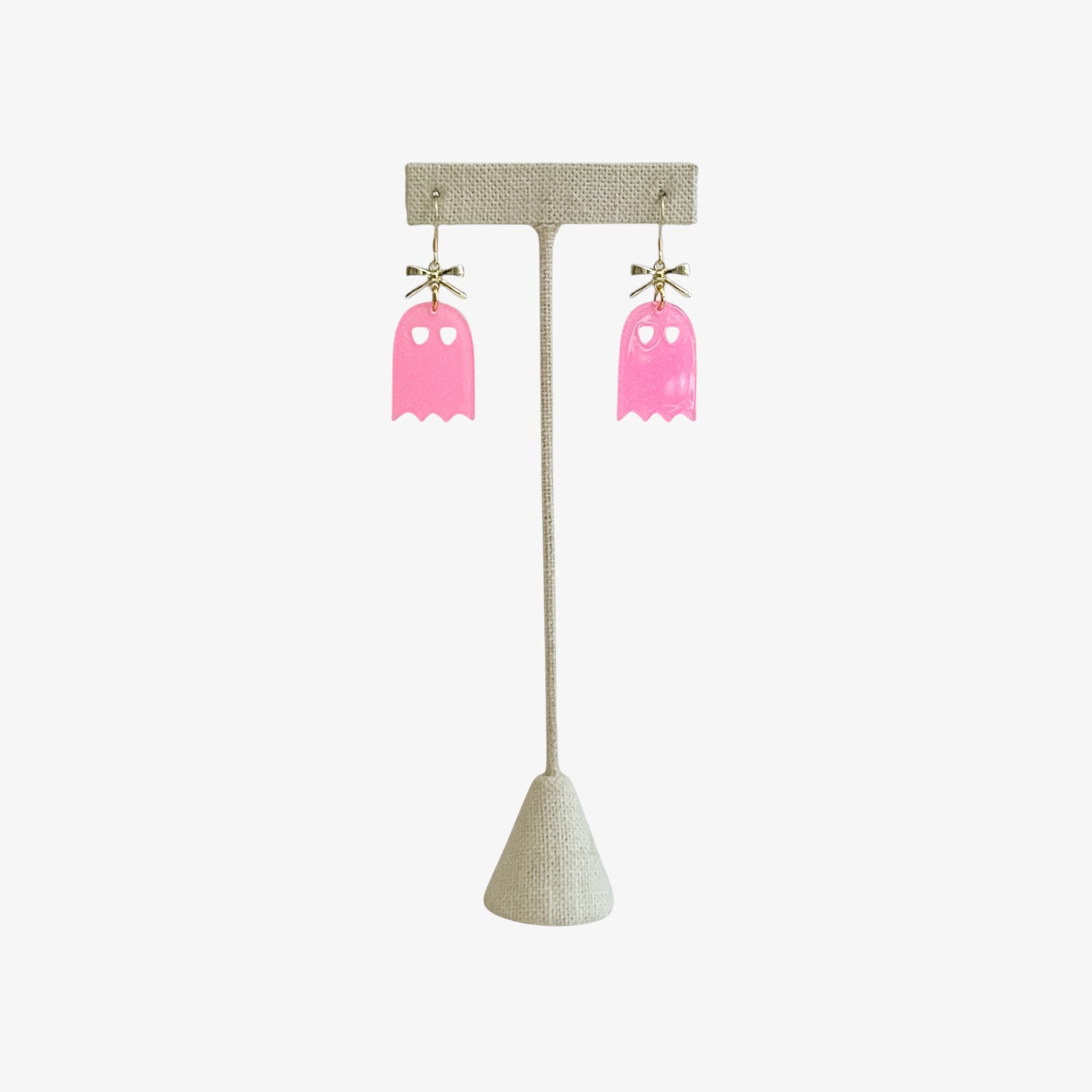 Pink ghost earrings topped with gold bows for a fun, girly twist on spooky-season style.
