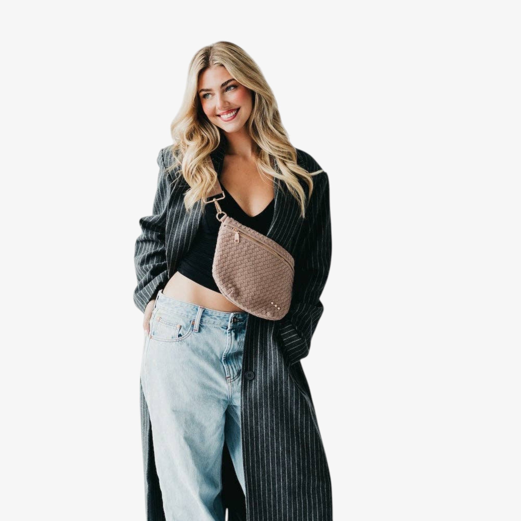 Suede Westlyn Bum Bag in Taupe brings chic texture and effortless style with its woven suede design and adjustable strap—perfect for hands-free days on the go.