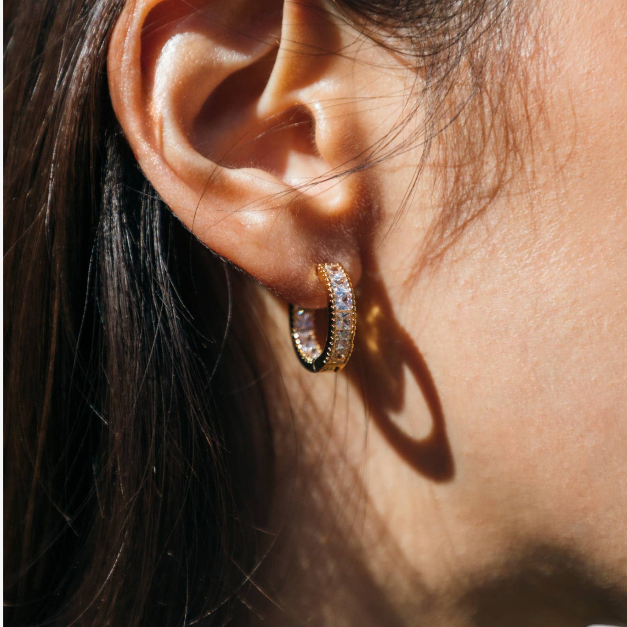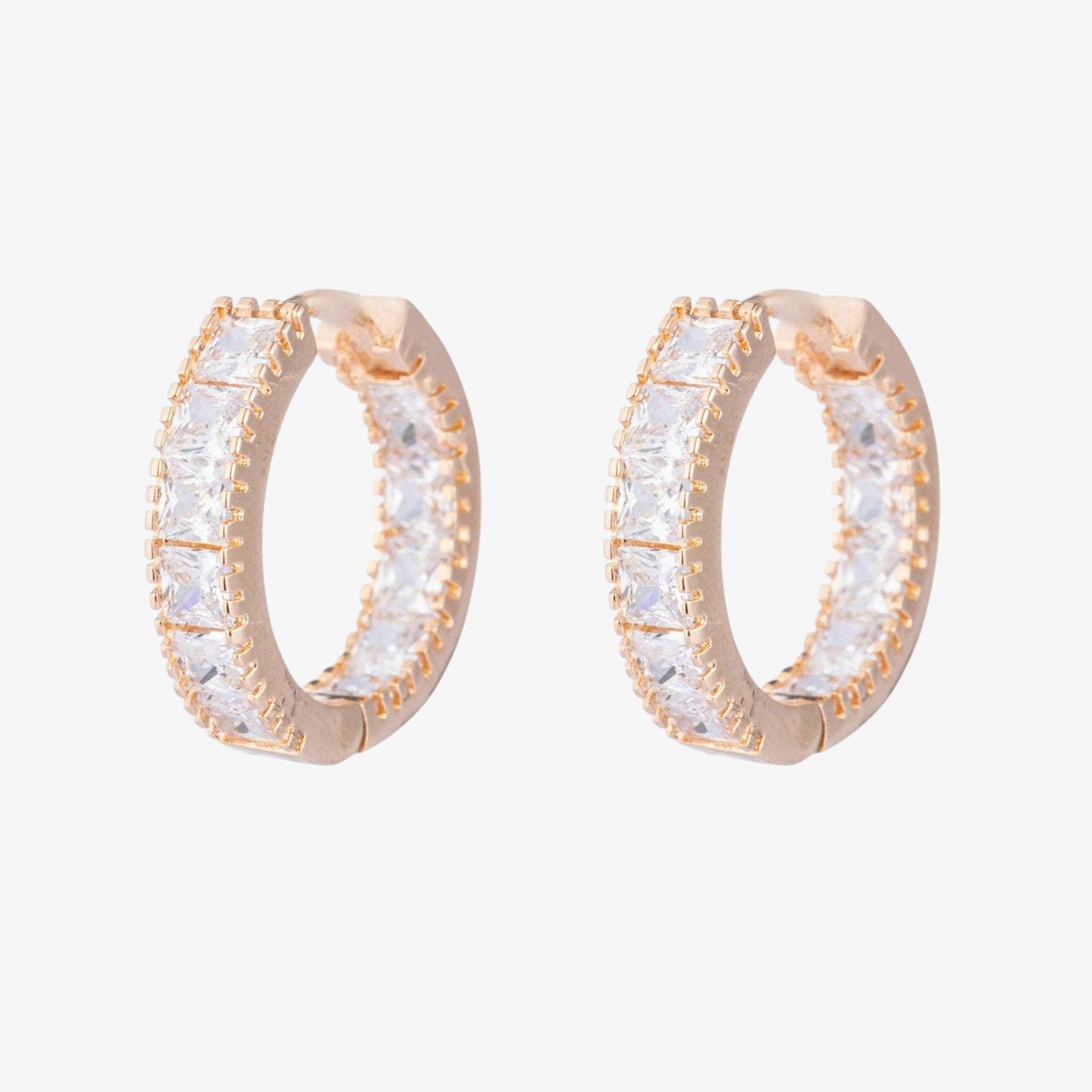 Classic and elegant, these gold hoop earrings feature a row of sparkling crystals that add the perfect touch of shine to any day or night look.
