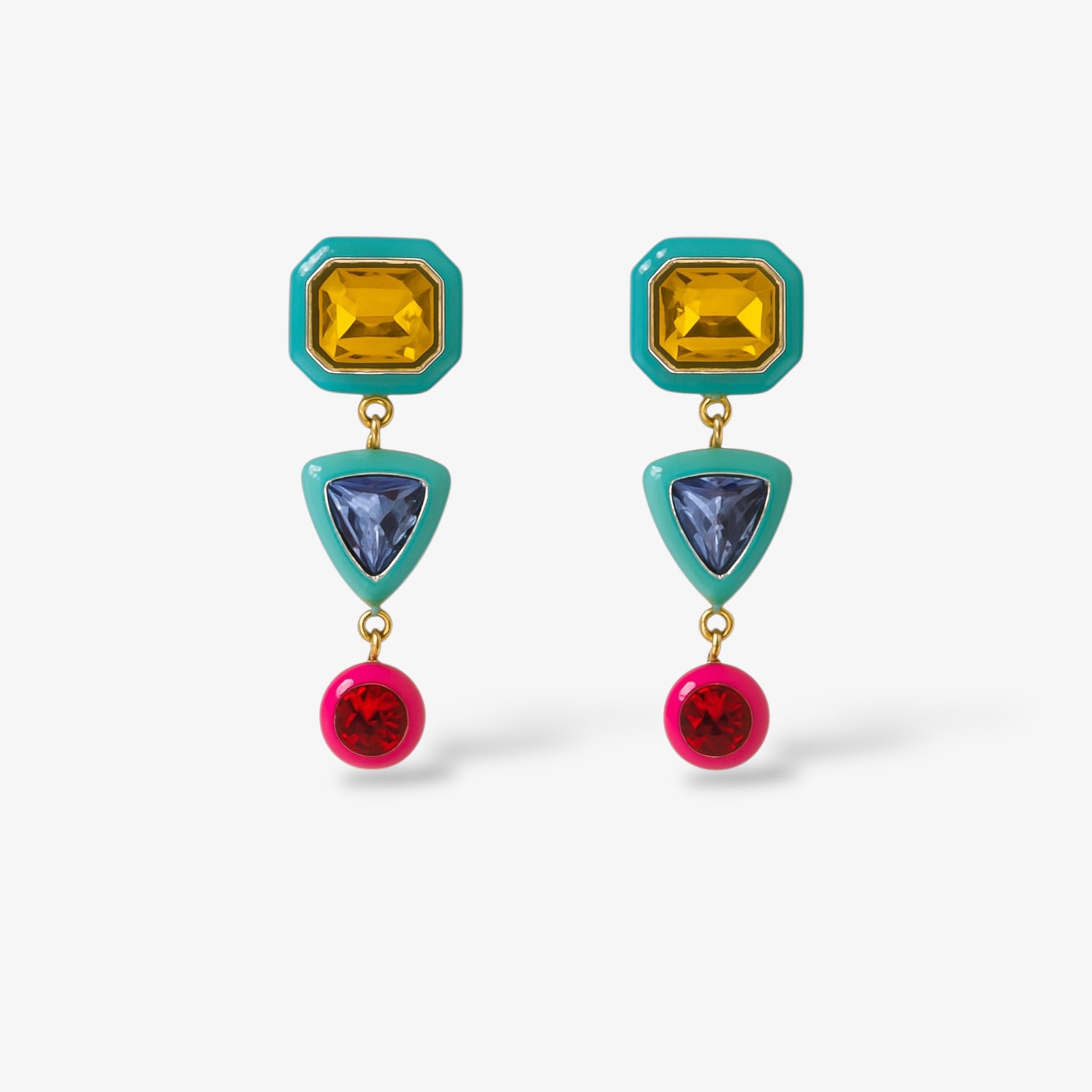 Bold color block drop earrings with geometric gemstone shapes for a playful statement look.
