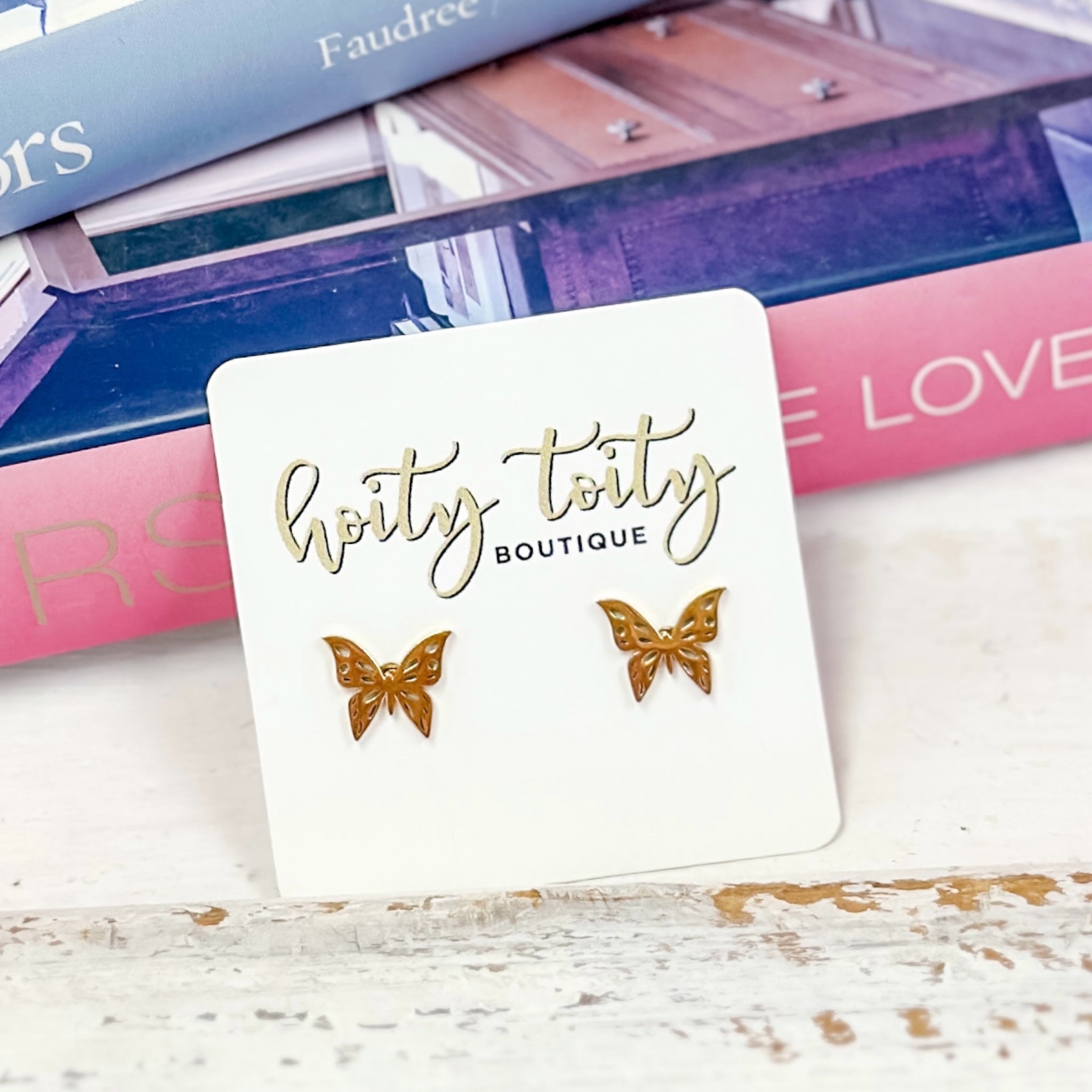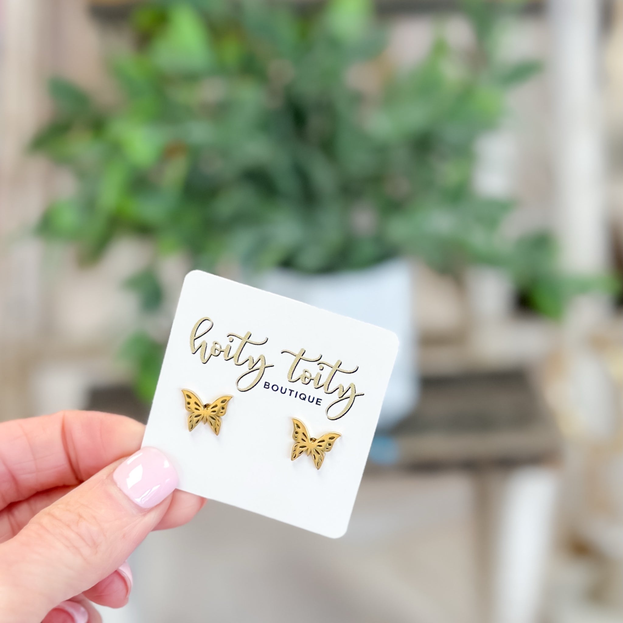 Shop gold butterfly stud earrings featuring timeless Southern charm, lightweight comfort, and versatile style for everyday wear or special occasions.