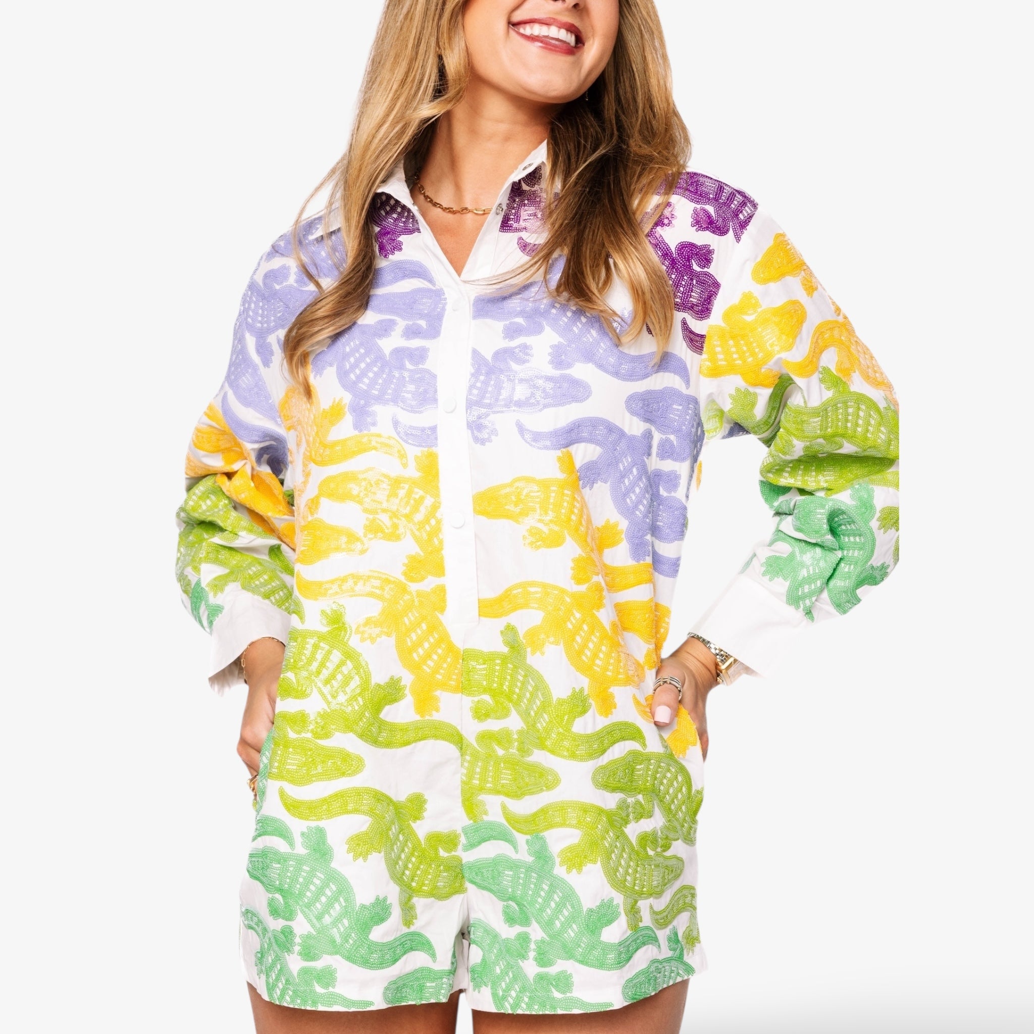 Vibrant Queen of Sparkles alligator sequin button-up romper crafted in crisp cotton for the bold, colorful Mardi Gras look everyone loves.