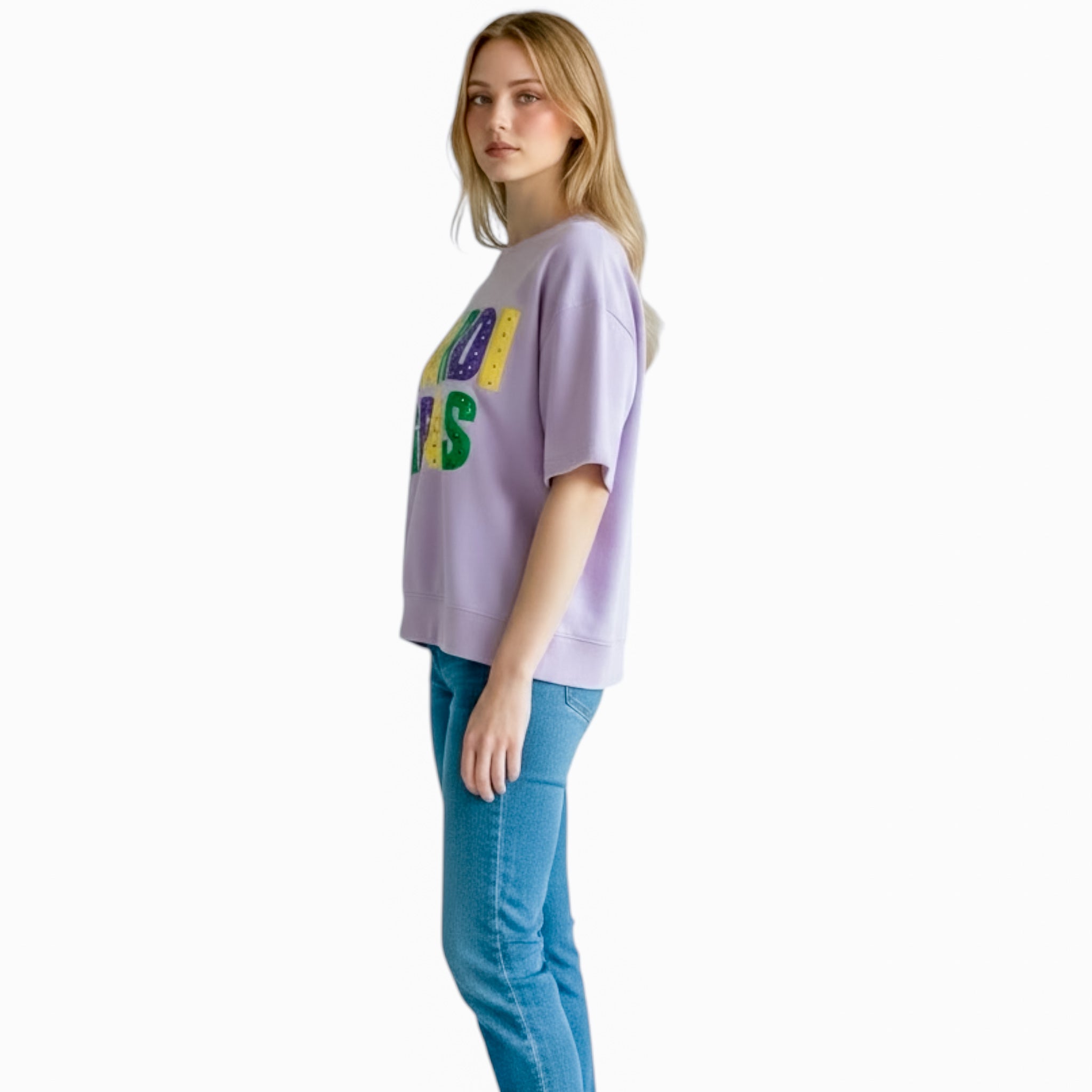 Playful Mardi Gras stud tee brings festive flair with bold studded lettering and an easy oversized fit that’s perfect for parade days and party nights.