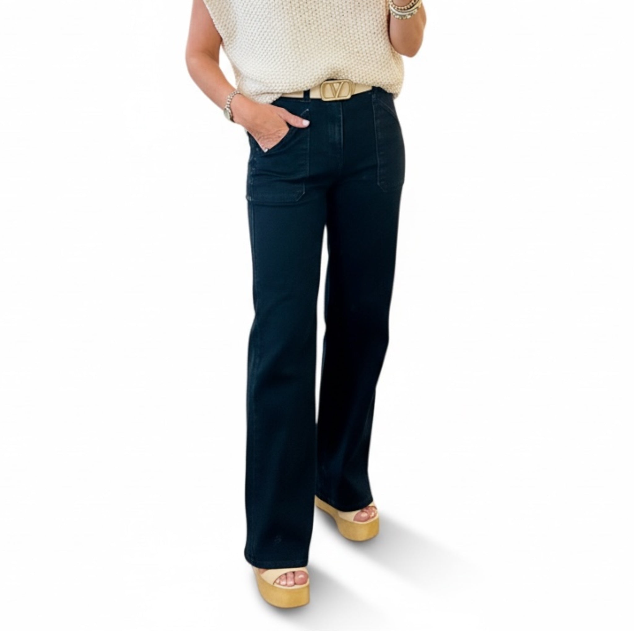 High-rise black denim jeans with statement patch pockets and a wide leg flare for a sleek, elongating silhouette.