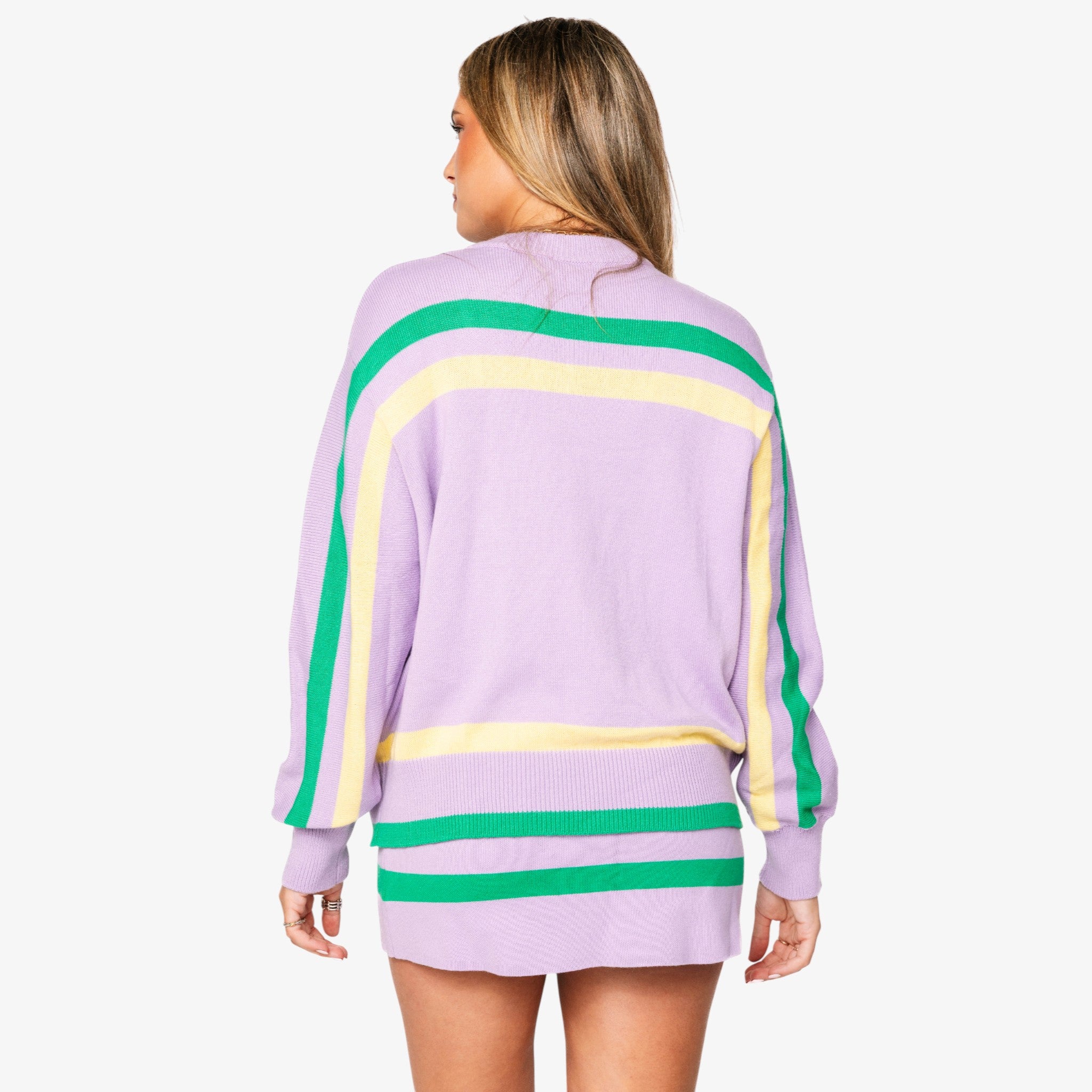 - Lilac sweater with yellow and green striped trim