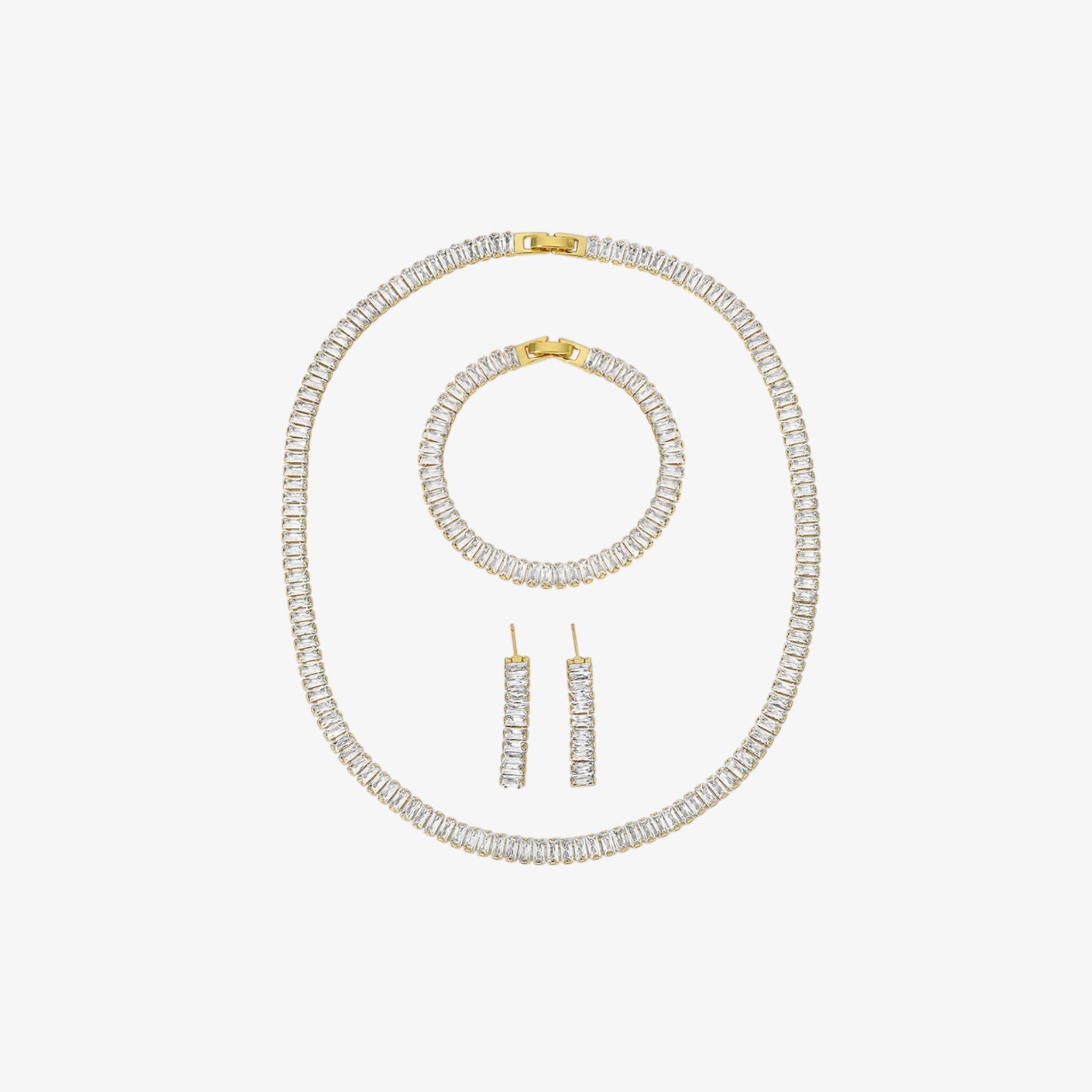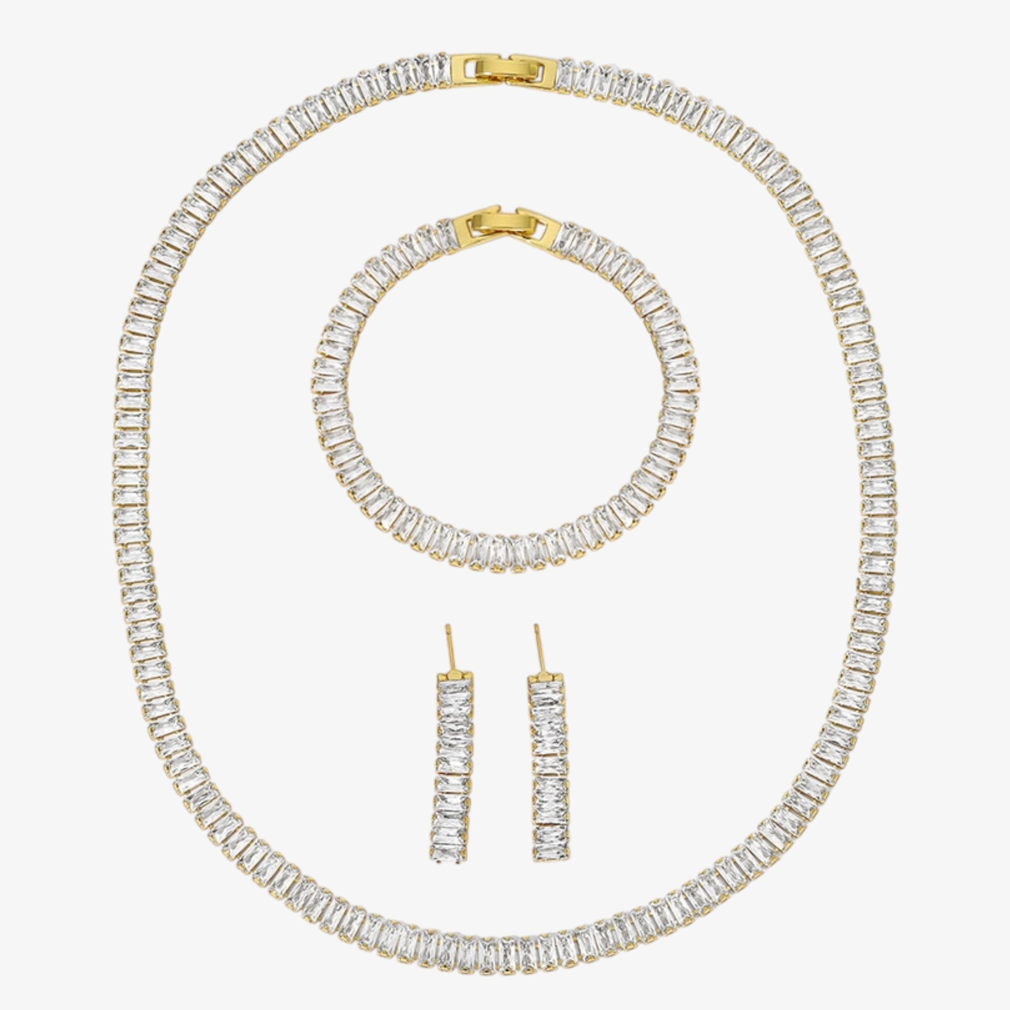 Luxury-inspired crystal jewelry set delivers a sleek, high-shine statement with baguette-cut sparkle designed to elevate both everyday looks and special occasions.