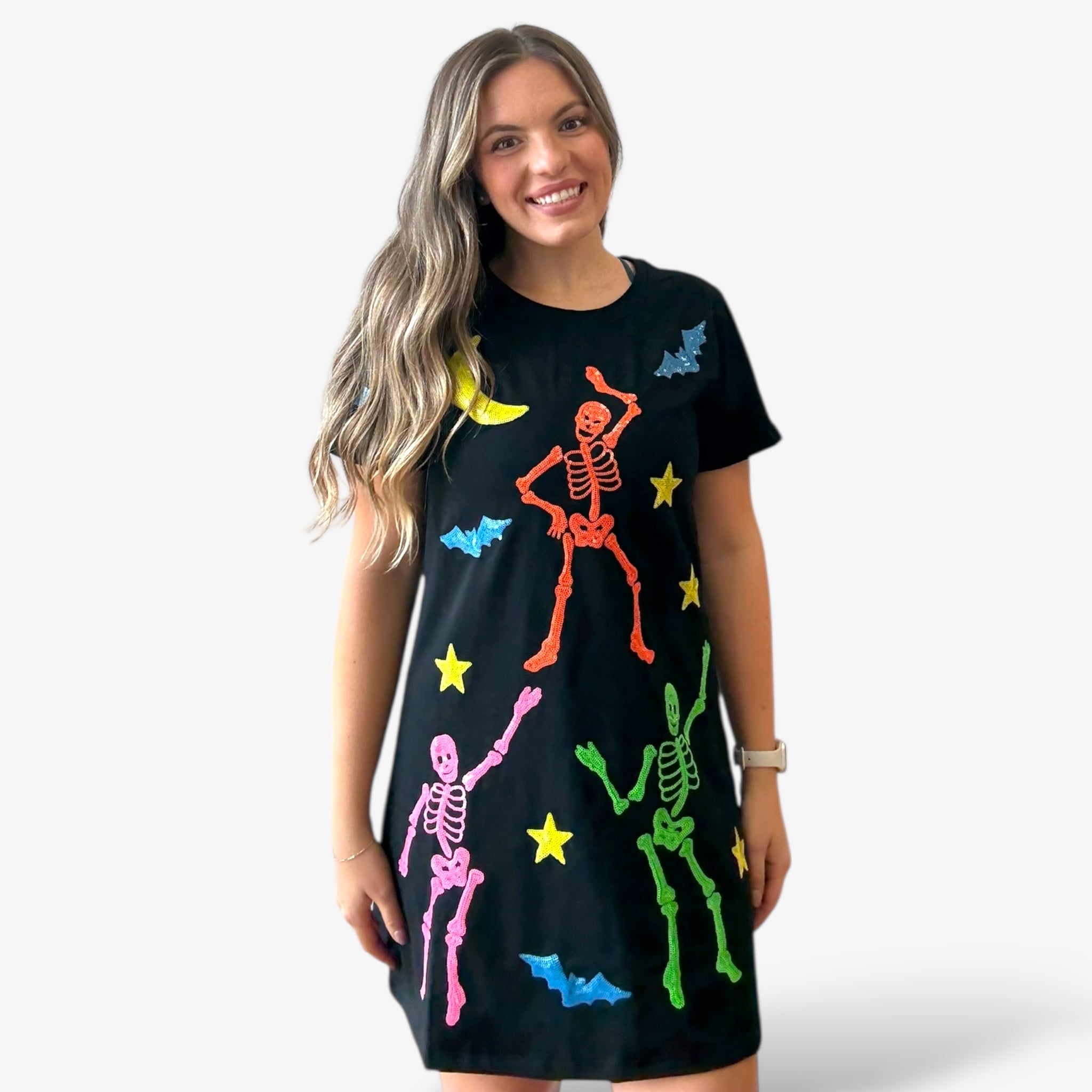 Dance into spooky season in this black short sleeve dress covered in colorful sequin skeletons, stars, moons, and bats.