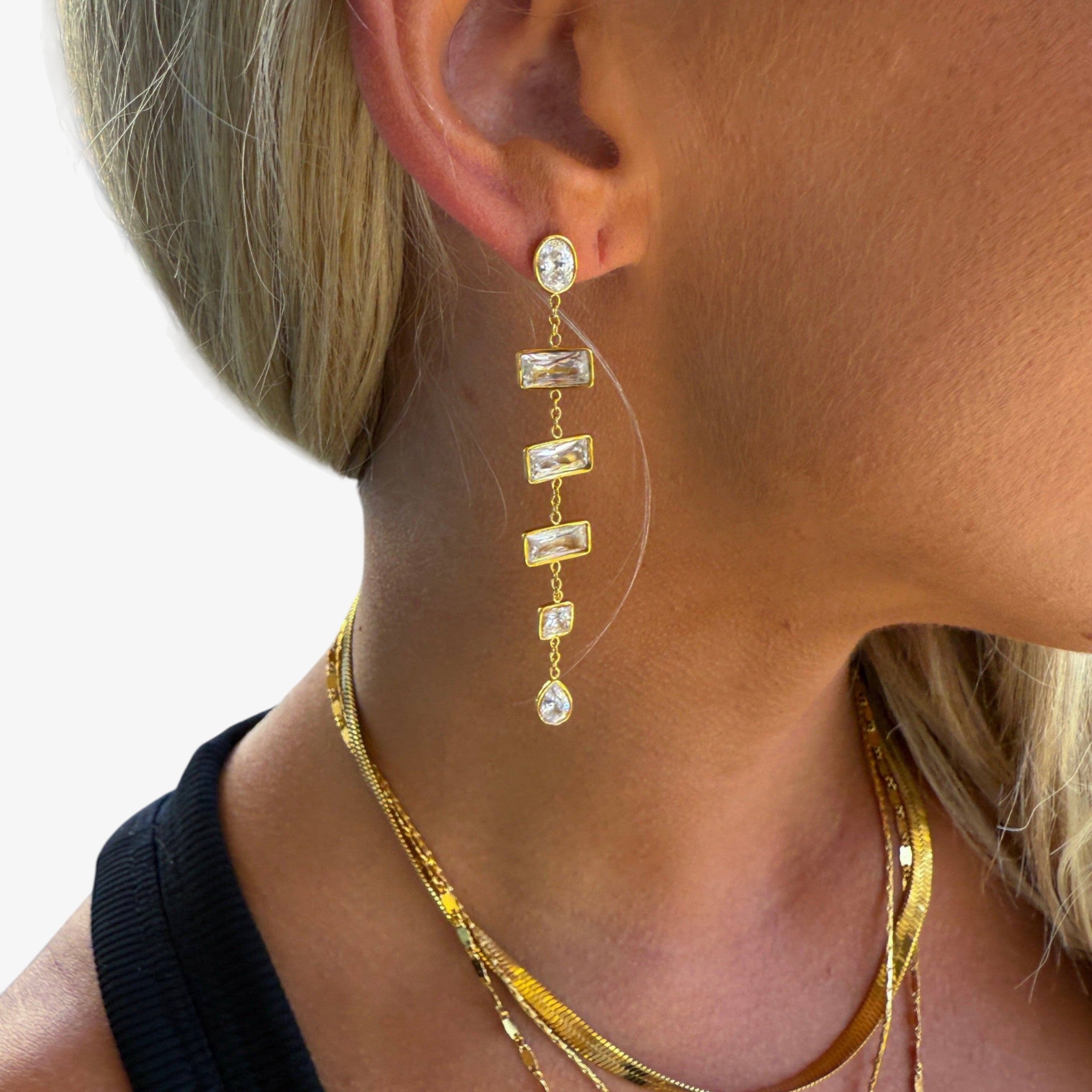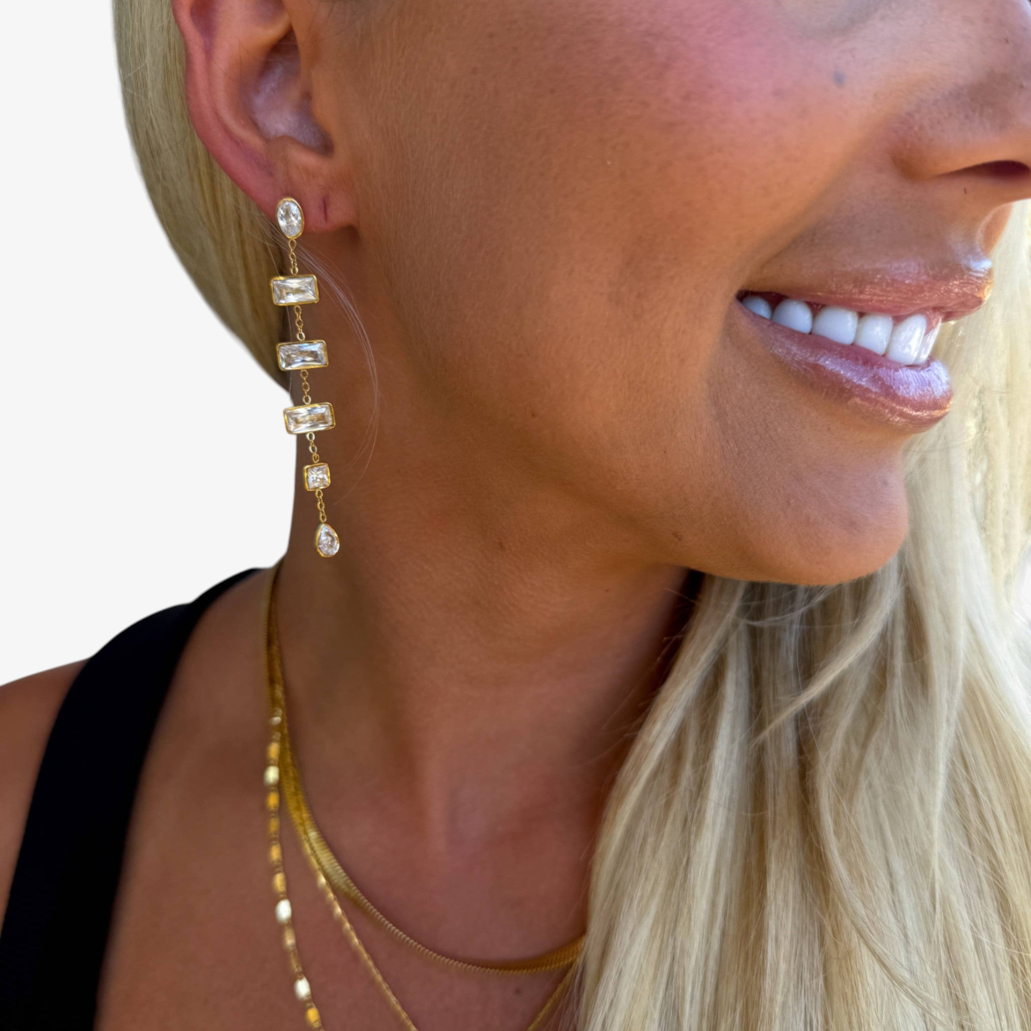 Layla earrings showcase a refined linear drop design with sparkling crystal accents, creating an elegant statement that moves beautifully and elevates both everyday and dressy looks.