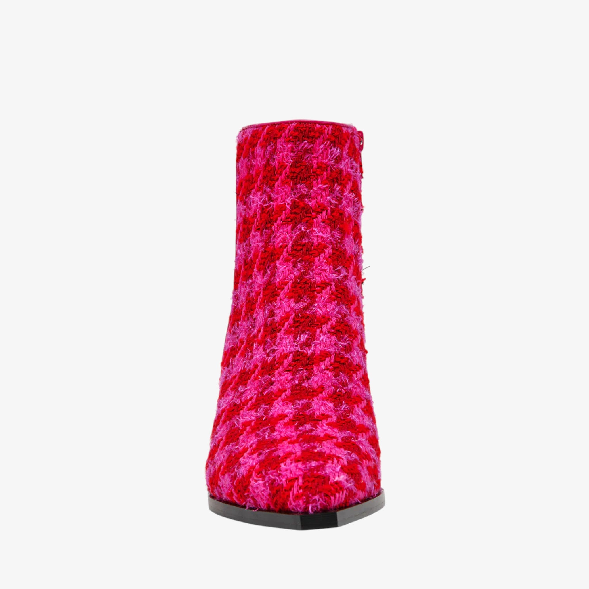 Bold fuchsia houndstooth bootie designed with a soft textured knit and a chic mini heel for a standout pop of color.