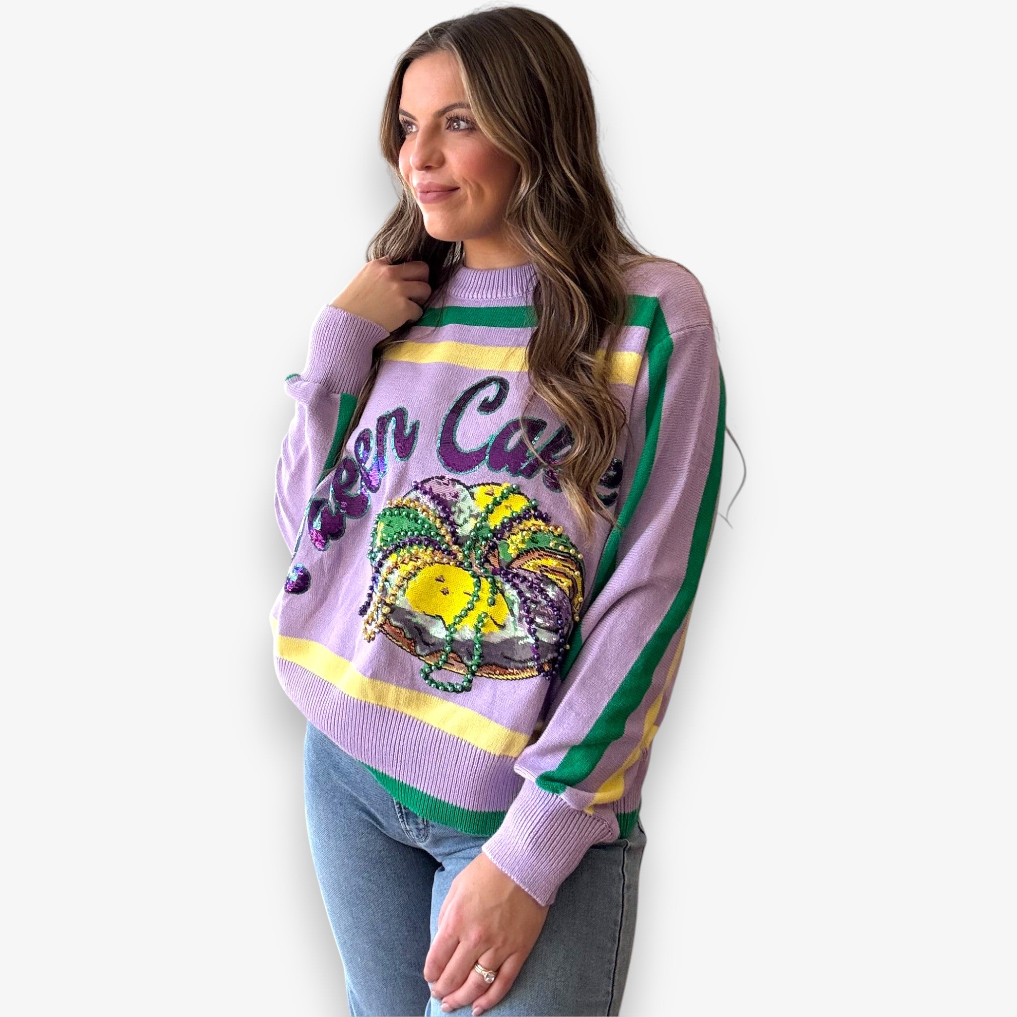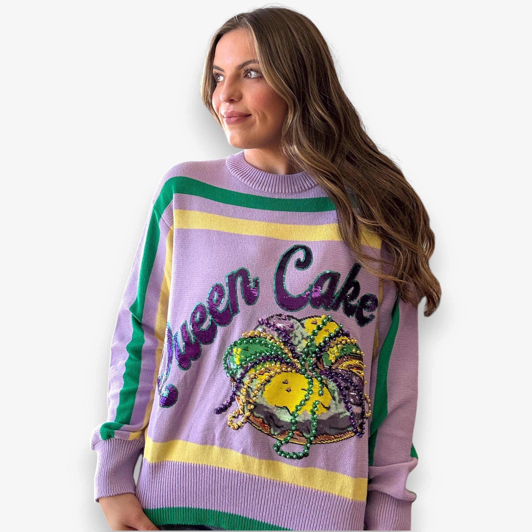 Bold Queen of Sparkles Officially Licensed Queen Cake striped sweater with sequin Mardi Gras detail that brings full color and sparkle to your festive wardrobe.