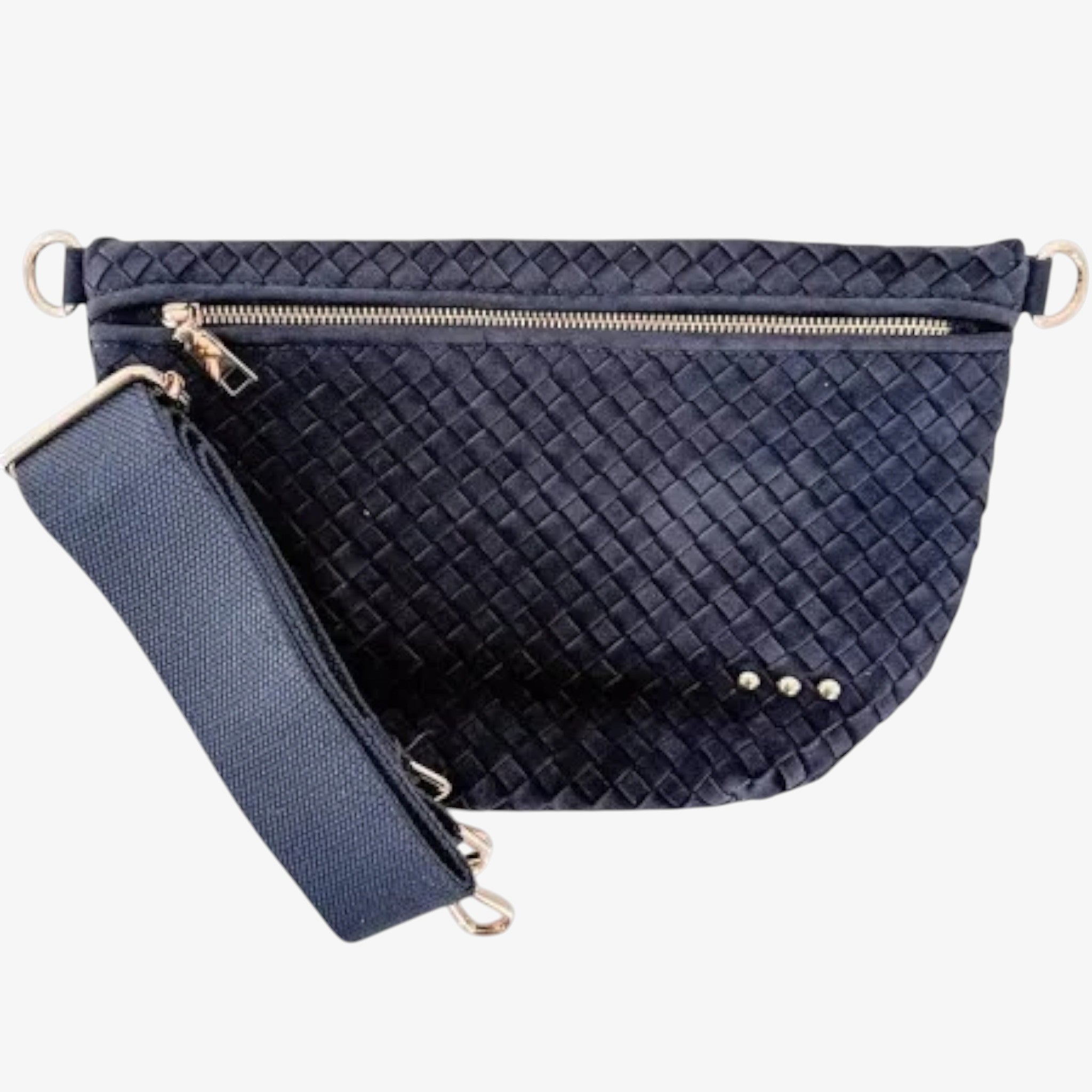 Suede woven Westlyn Bum Bag in navy blue with gold hardware, designed for hands-free convenience and polished everyday wear.