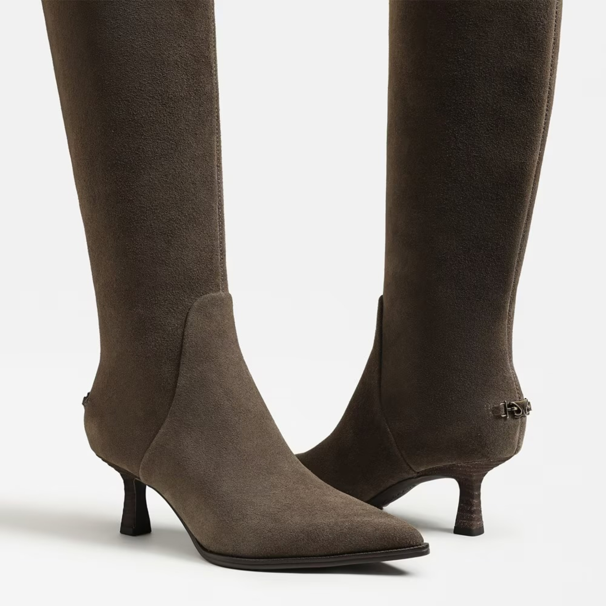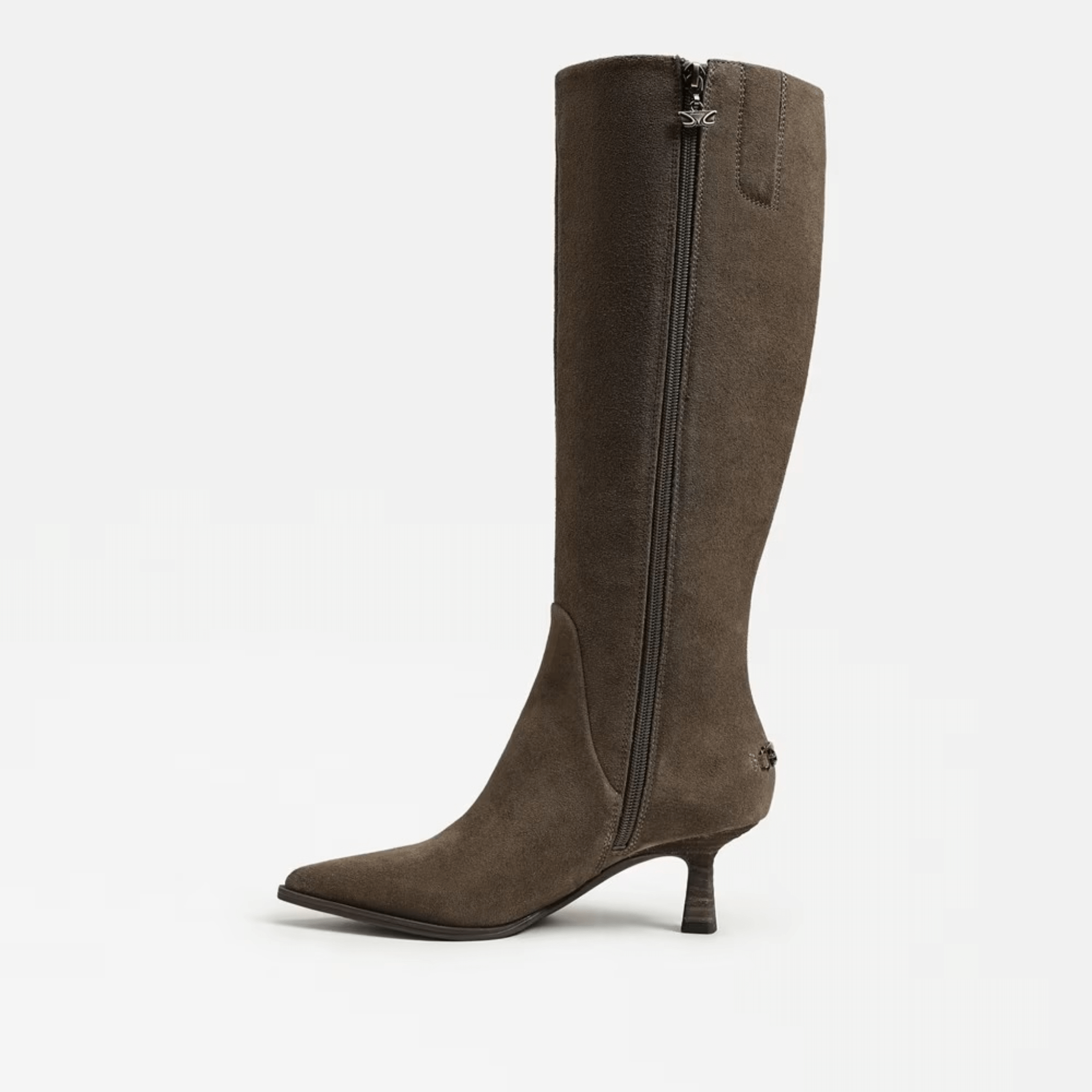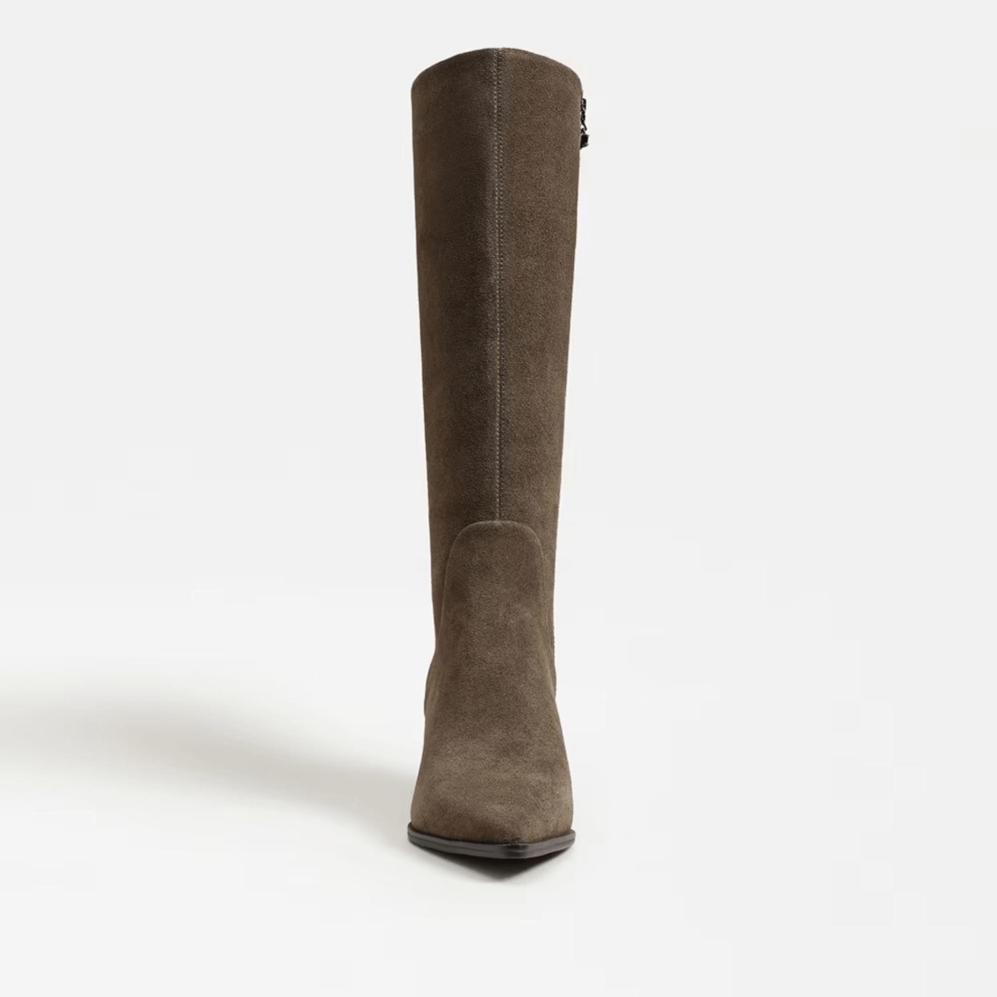 The Yulia Knee High Boot is a chic tall suede design featuring a sleek fit and stacked block heel for timeless, elevated style.