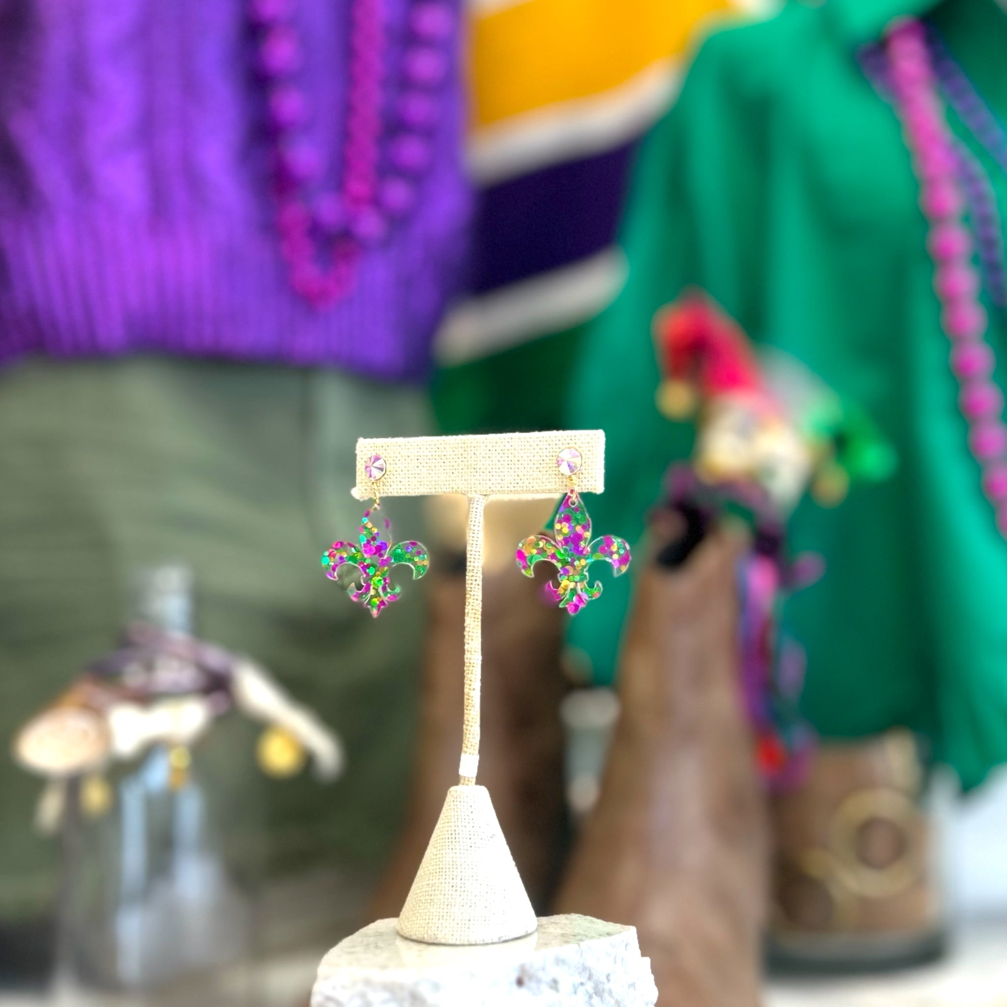 Carnival Confetti Earrings featuring a glitter-filled fleur-de-lis drop in classic Mardi Gras colors with an iridescent crystal stud for bold, festive sparkle.