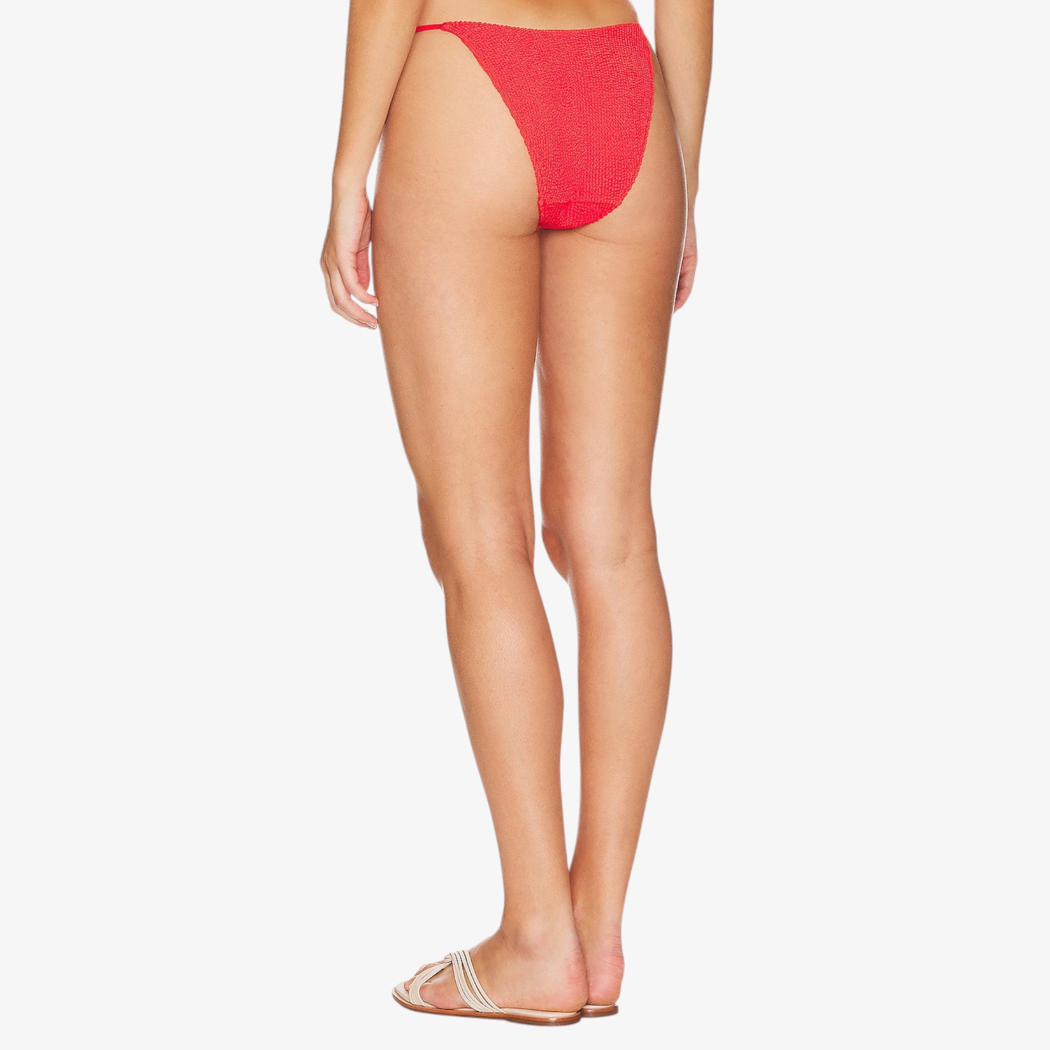 This red scrunch bottom features a side tie closure for a perfect fit, and the textured fabric adds a touch of luxury to your beach look.