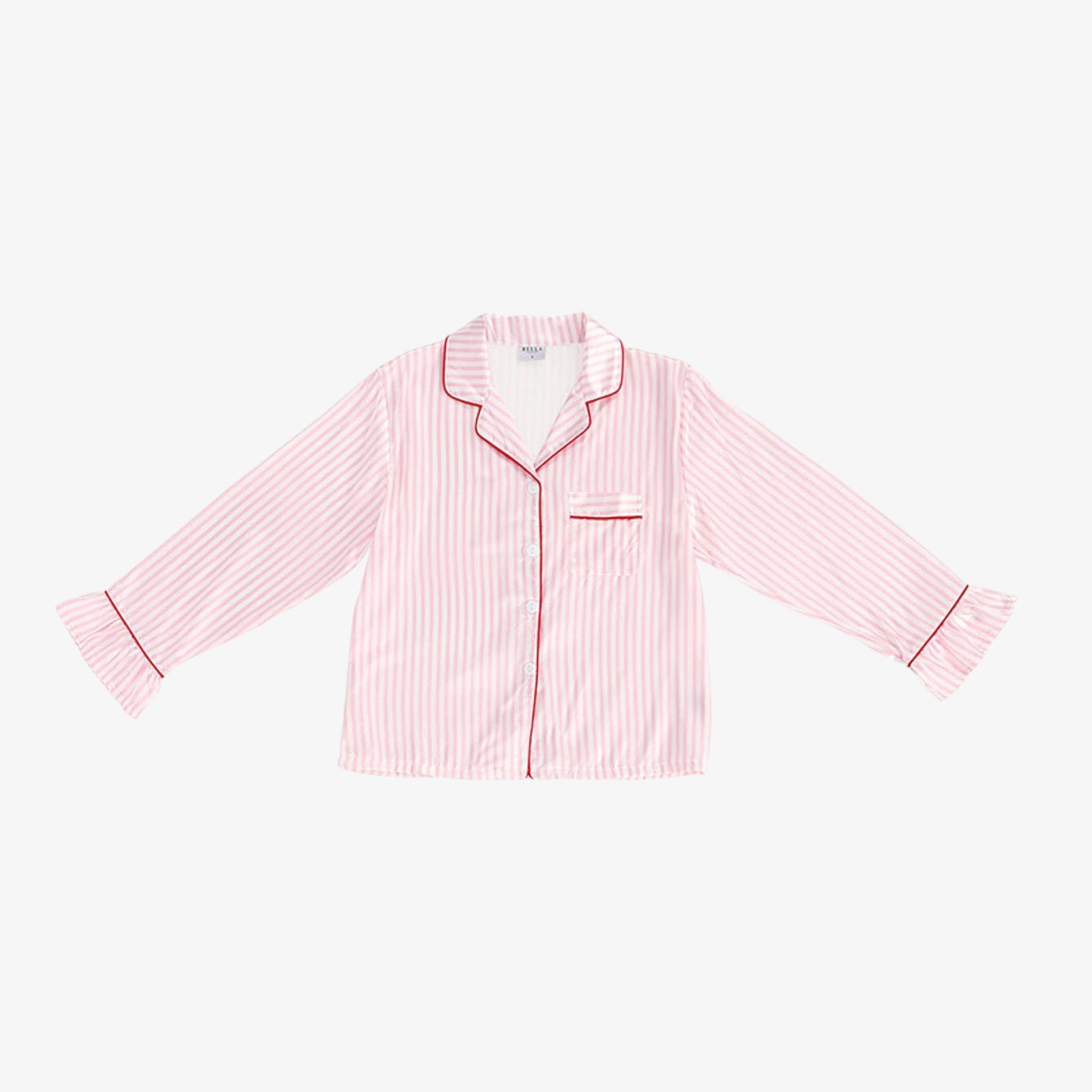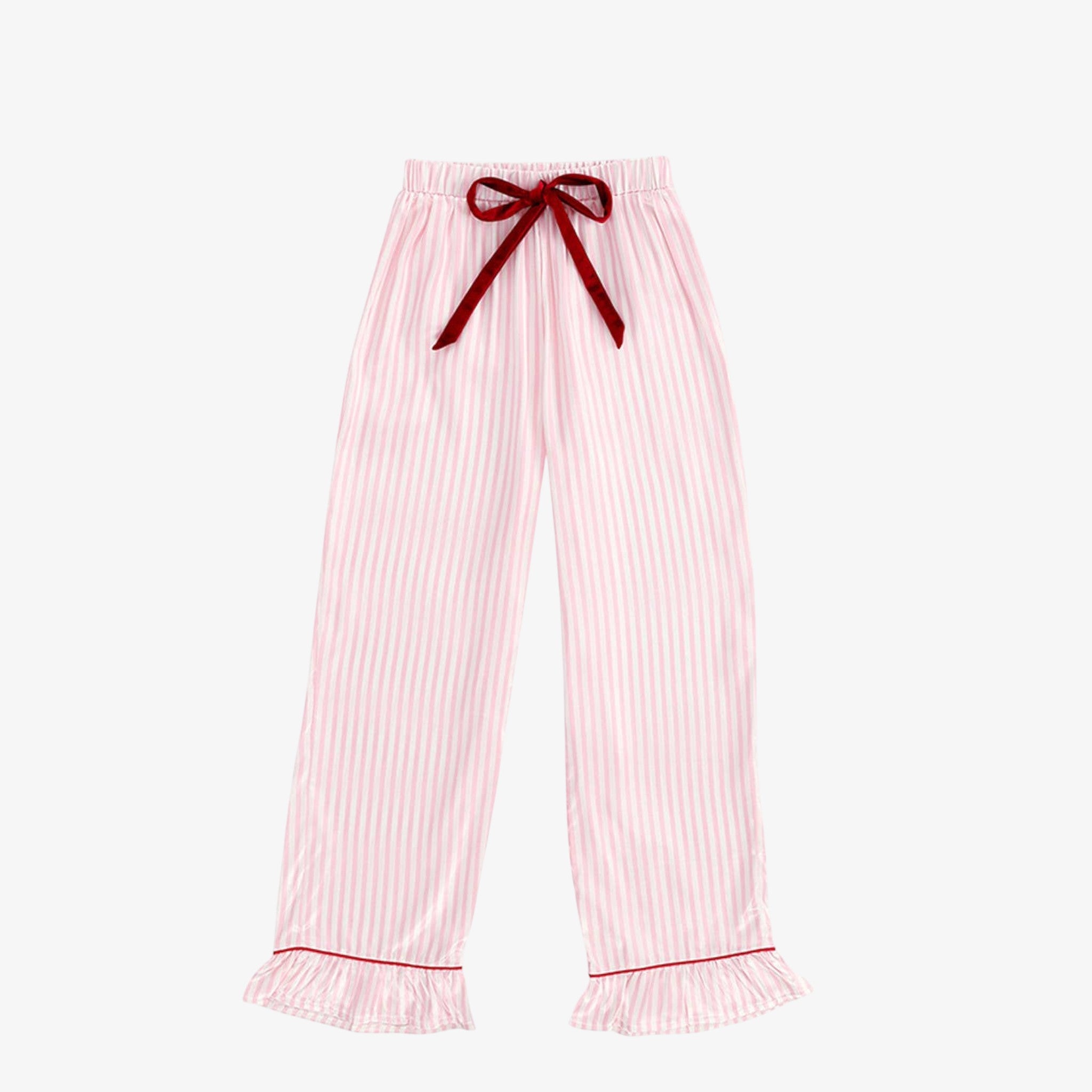Pretty pink stripe pajama set designed with ruffle trim and contrast red piping for chic, cozy lounging.