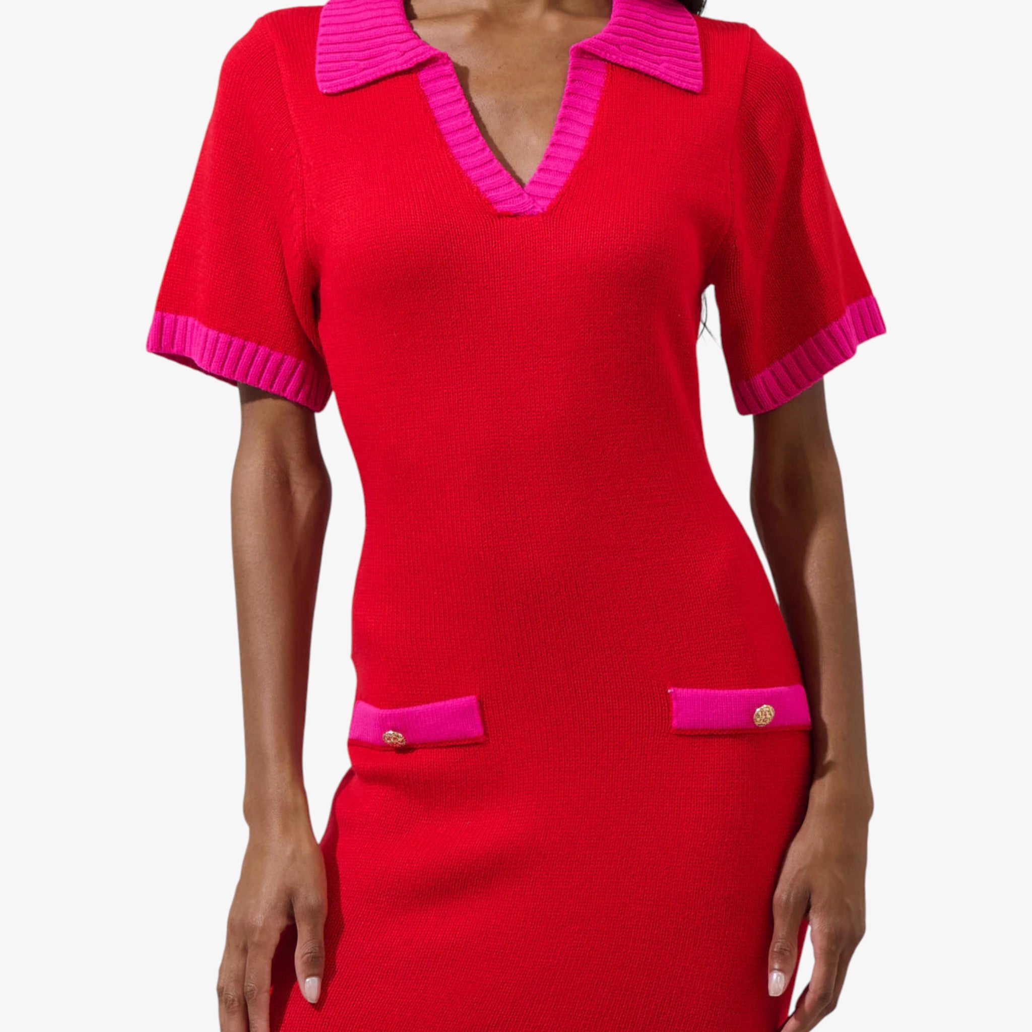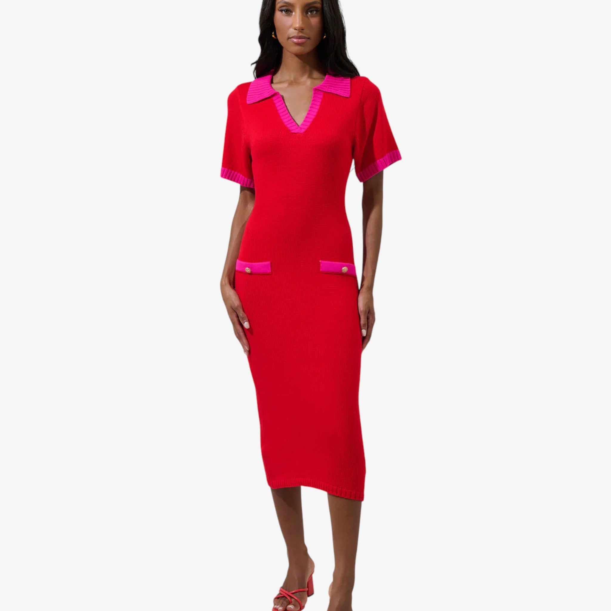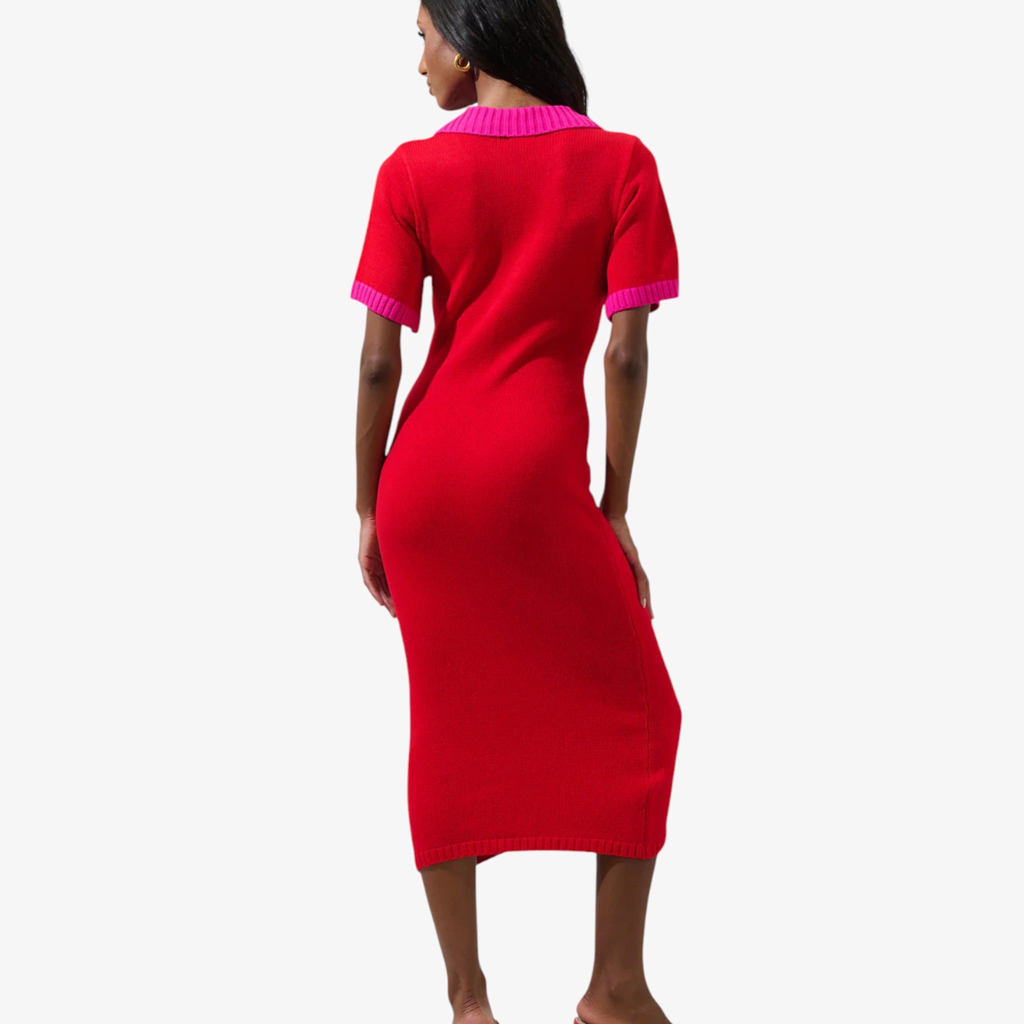Bold red and pink sweater midi dress designed for effortless confidence and chic sophistication.