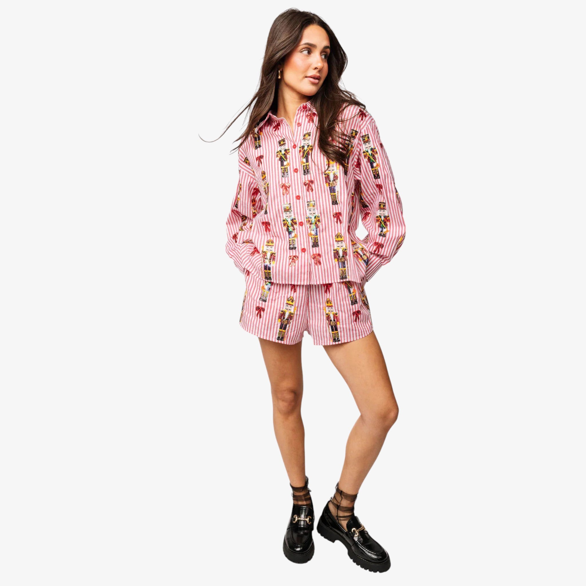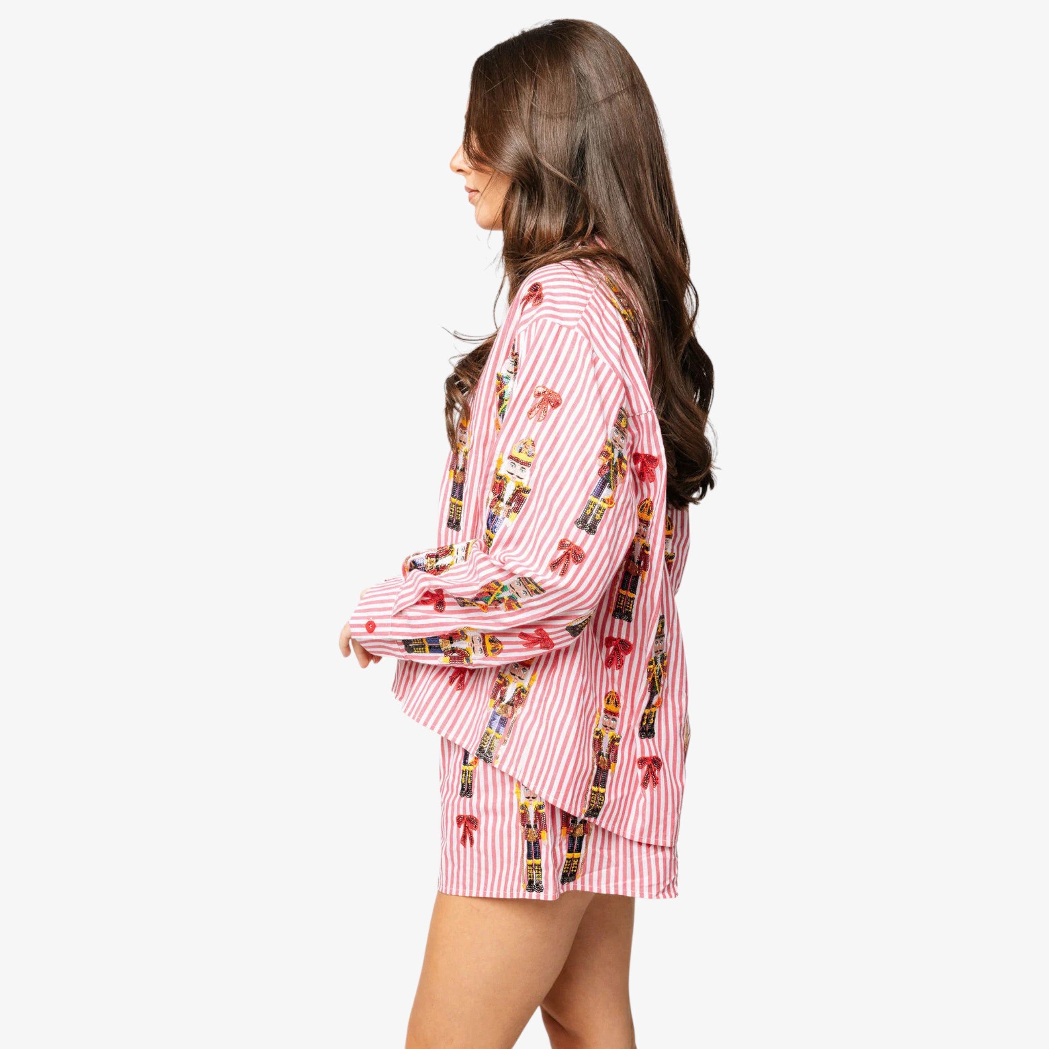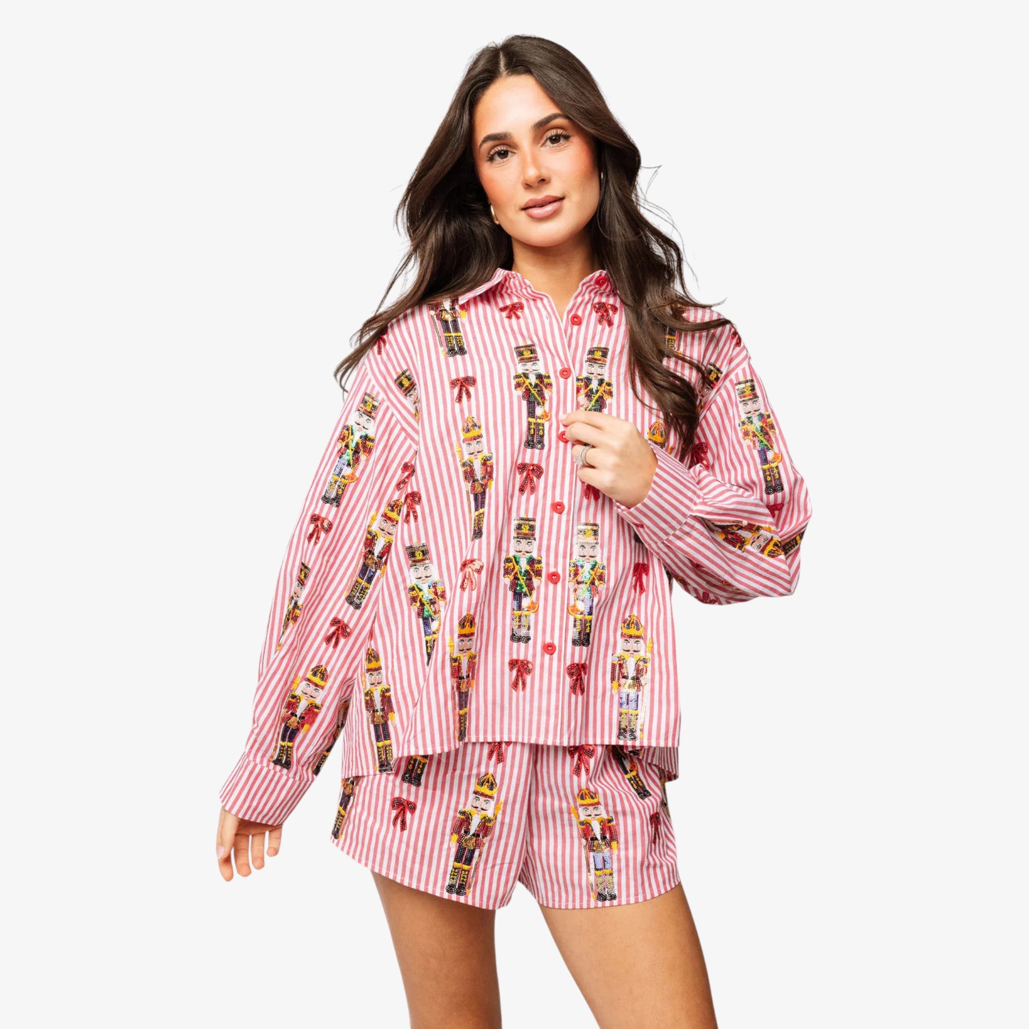 Playful holiday sparkle shines bright in this Queen of Sparkles Nutcracker & Bow Button Up Top featuring red and white stripes with dazzling sequin nutcrackers and festive bows.