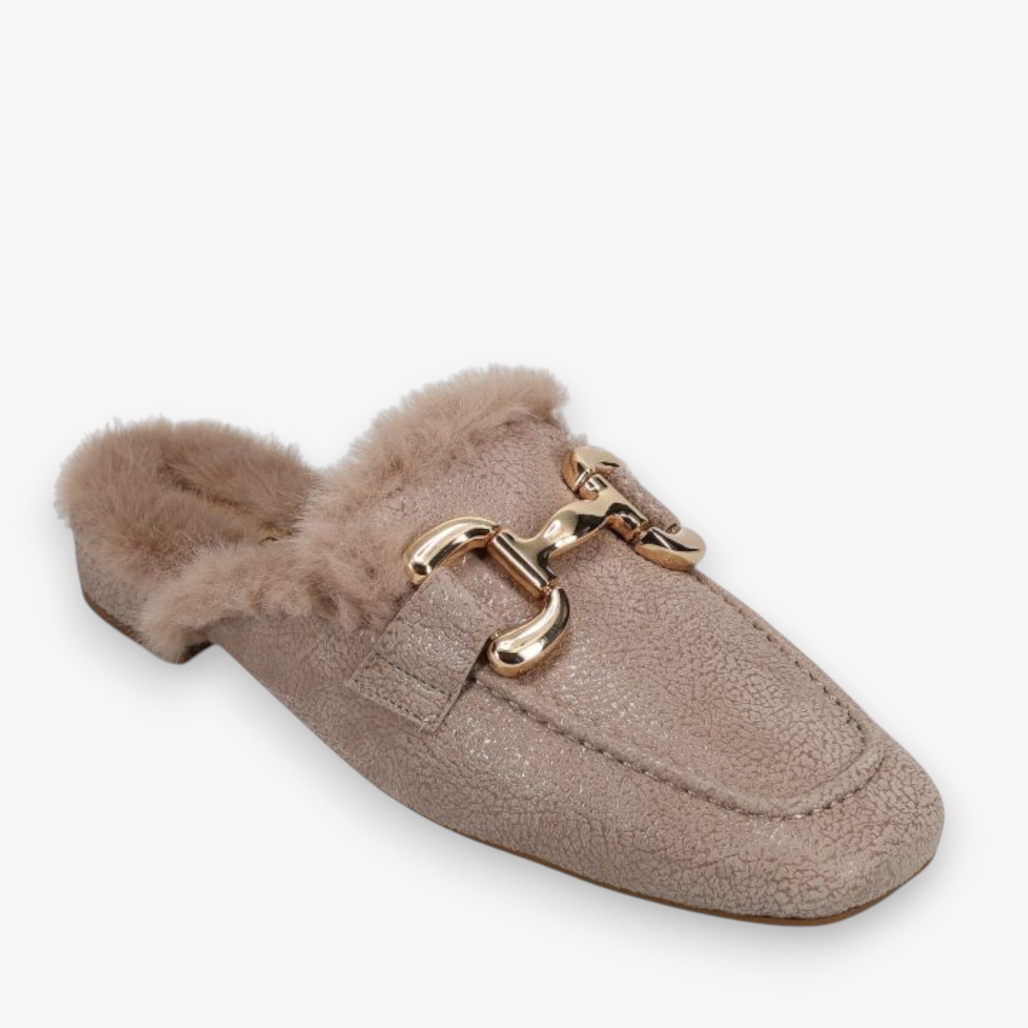 Elevate your off-duty style with the Skyla Mule featuring plush faux fur and gold horsebit detail for a cozy yet polished look.