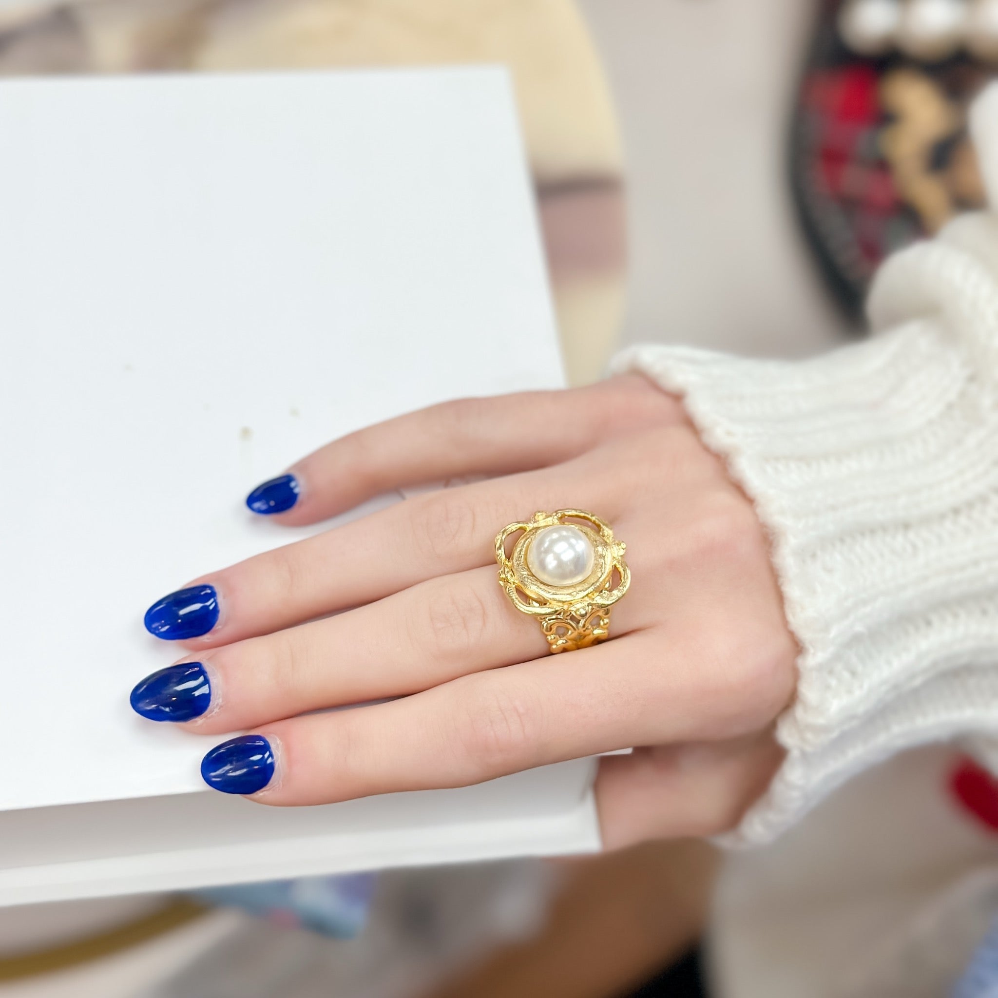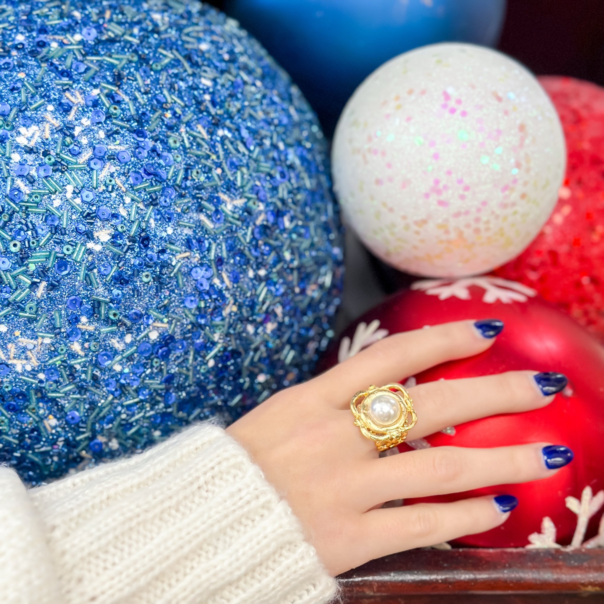 Classic elegance meets Southern charm in this statement ring featuring a luminous pearl set within intricate gold scrollwork.