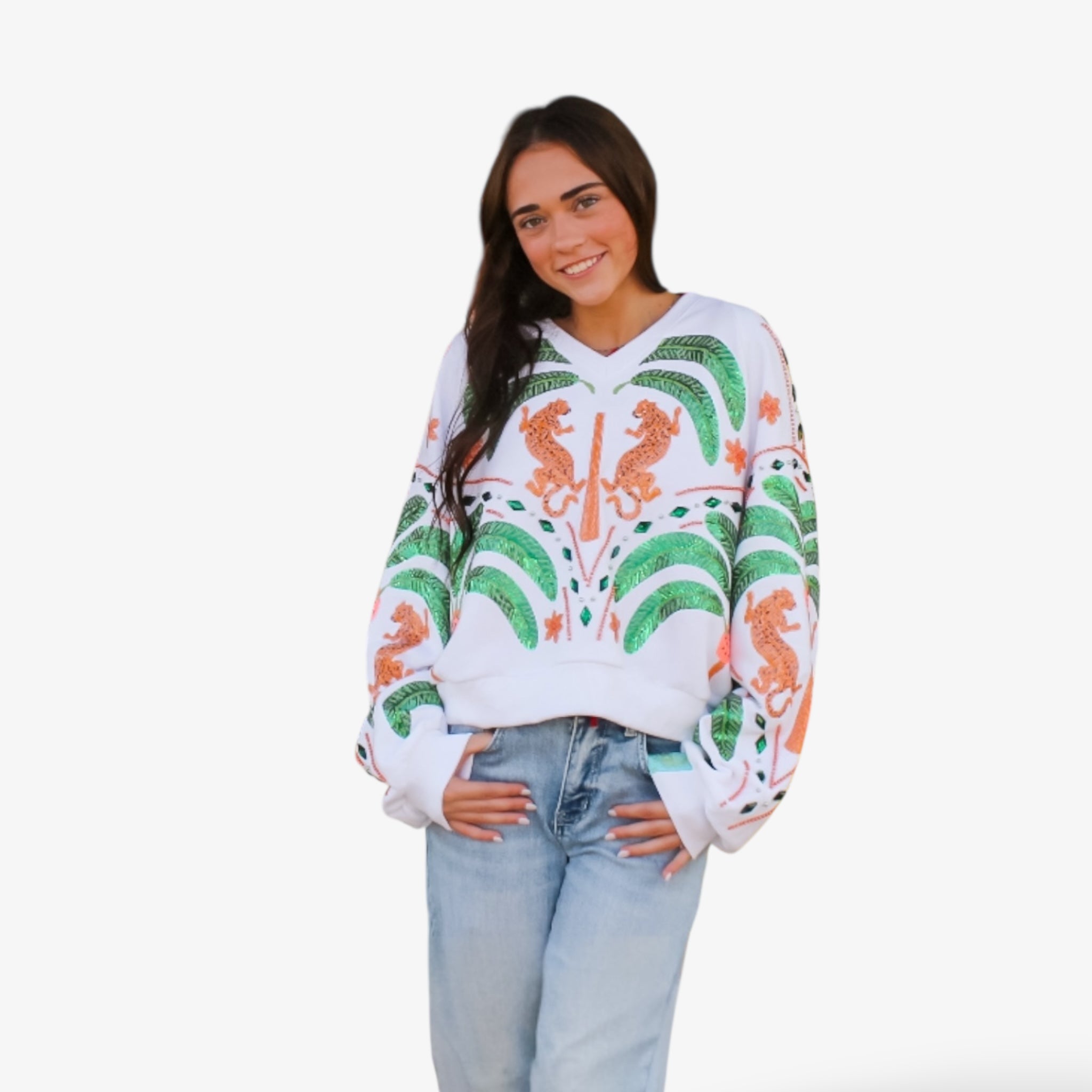 Your vacay wardrobe just got wilder! The Palm Party V-Neck Sweatshirt is a tropical dream come true, featuring bold palm fronds, fierce jaguars, and a relaxed oversized fit. Lightweight but cozy—perfect for those breezy beach nights or chill days when you still wanna stand out.