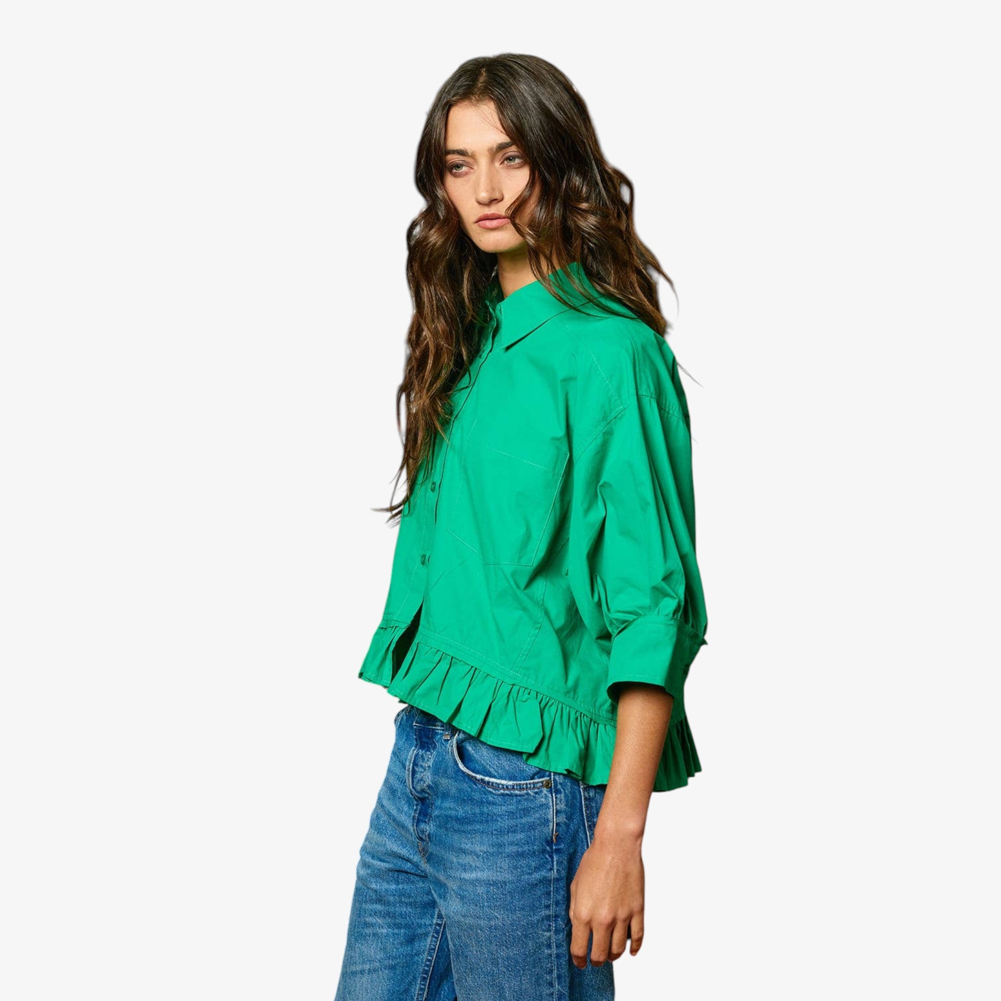 Crisp poplin button-front top featuring a feminine ruffled hem and relaxed silhouette that instantly elevates everyday denim and casual outfits.