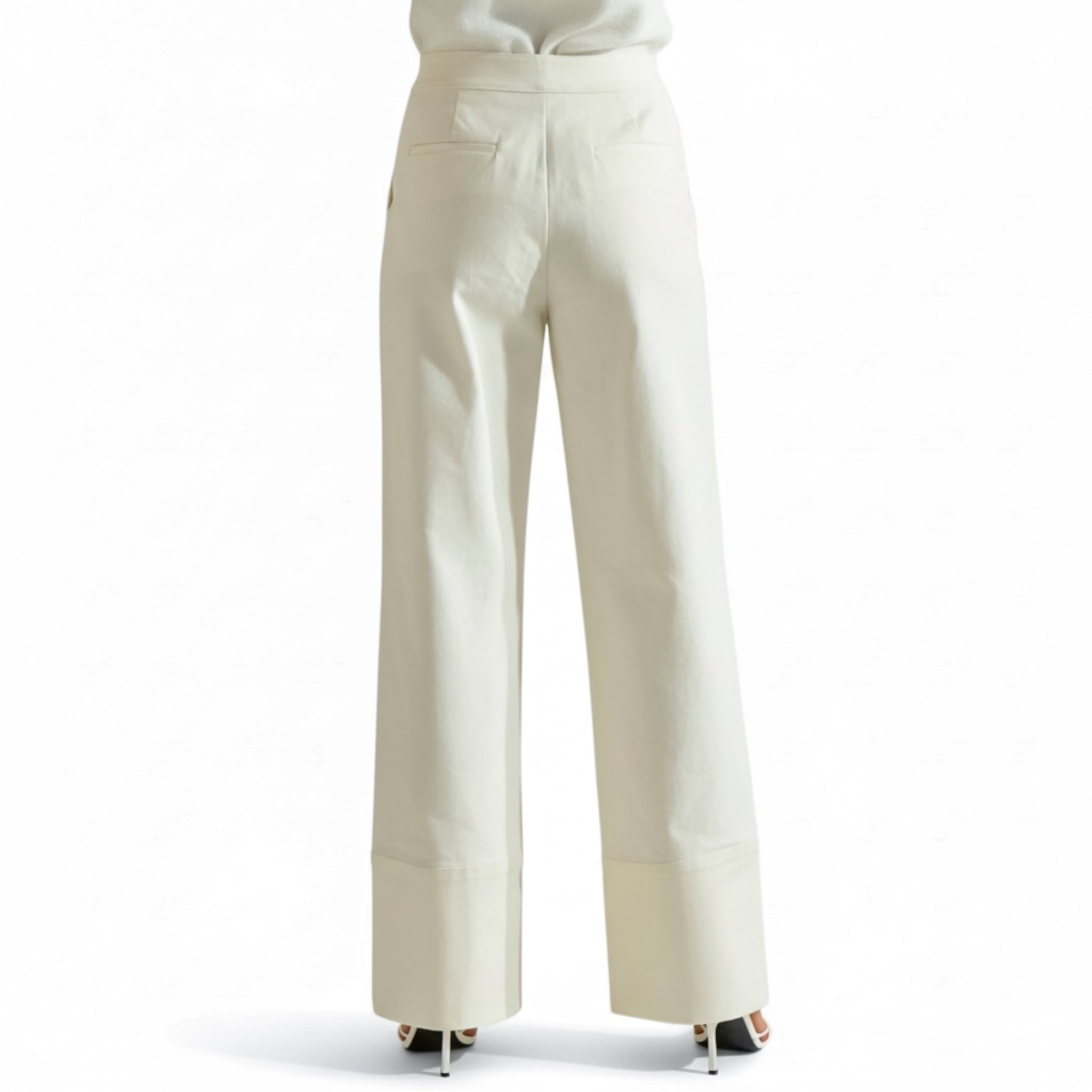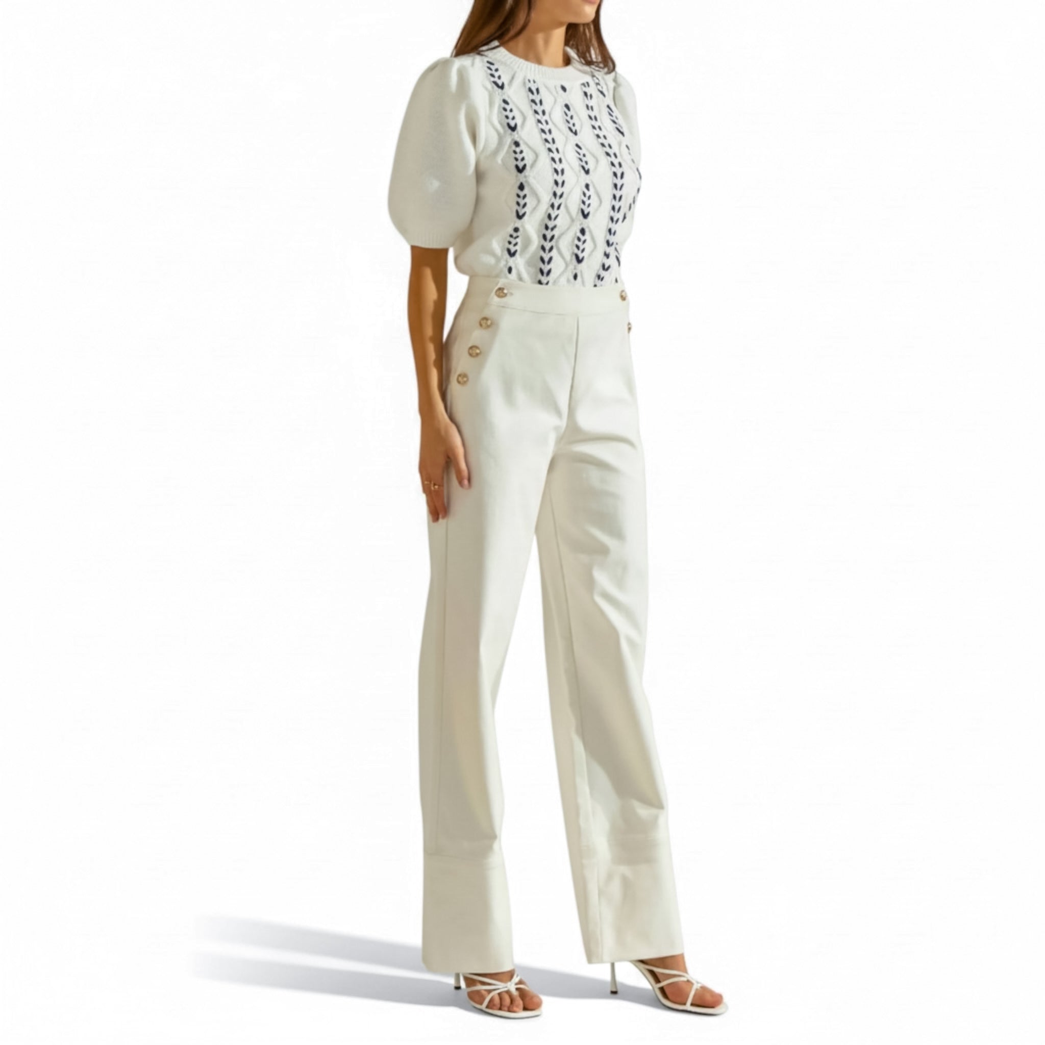 Polished ivory trousers with gold button detailing offer a tailored, elevated look that’s flattering, timeless, and perfect for workdays or dressy occasions.