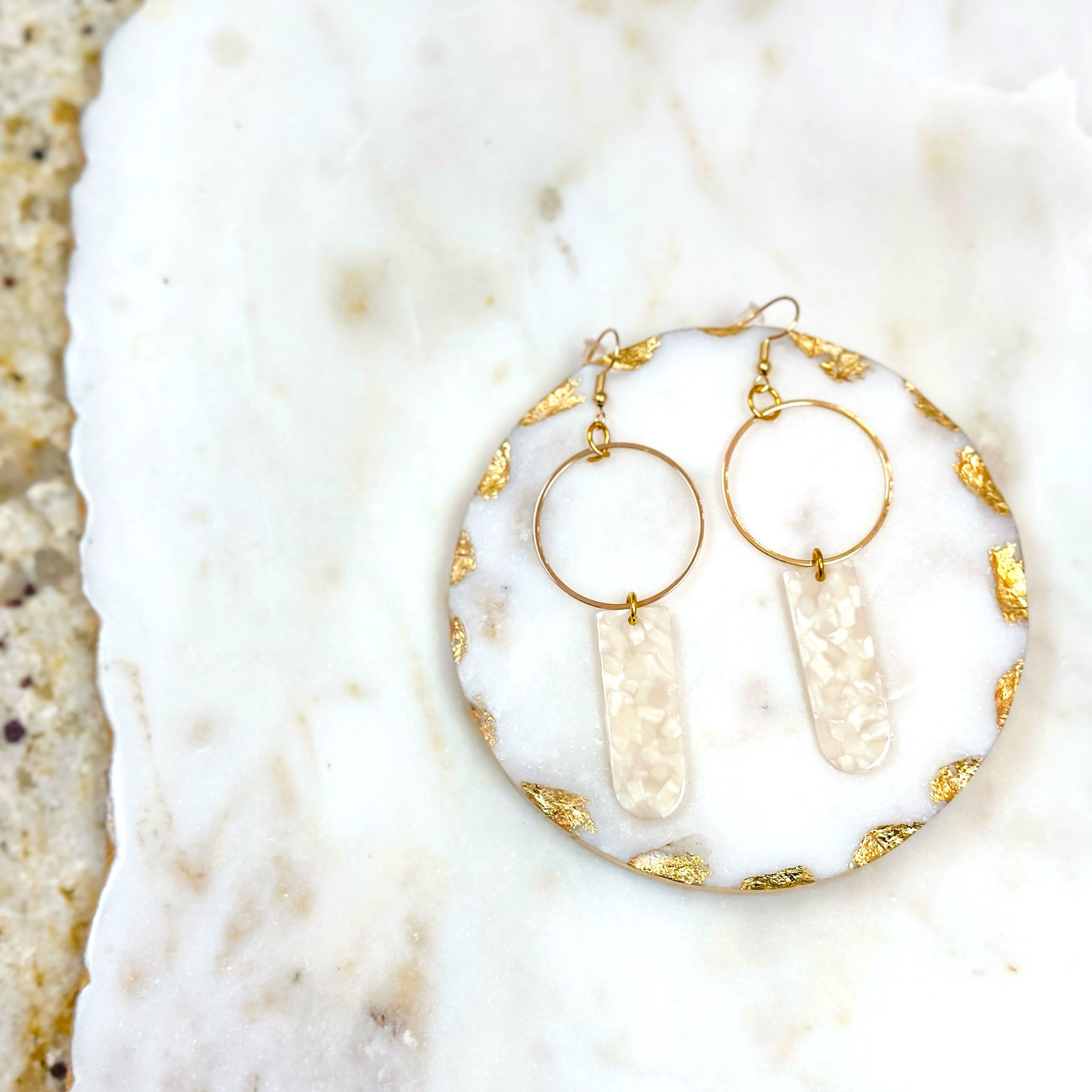 Lightweight acrylic drop earrings featuring a gold hoop and marbled ivory rectangle for an elevated, modern look.