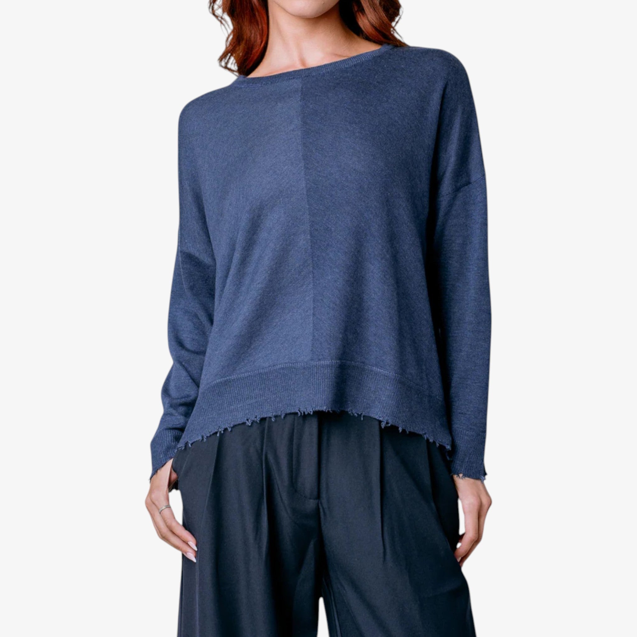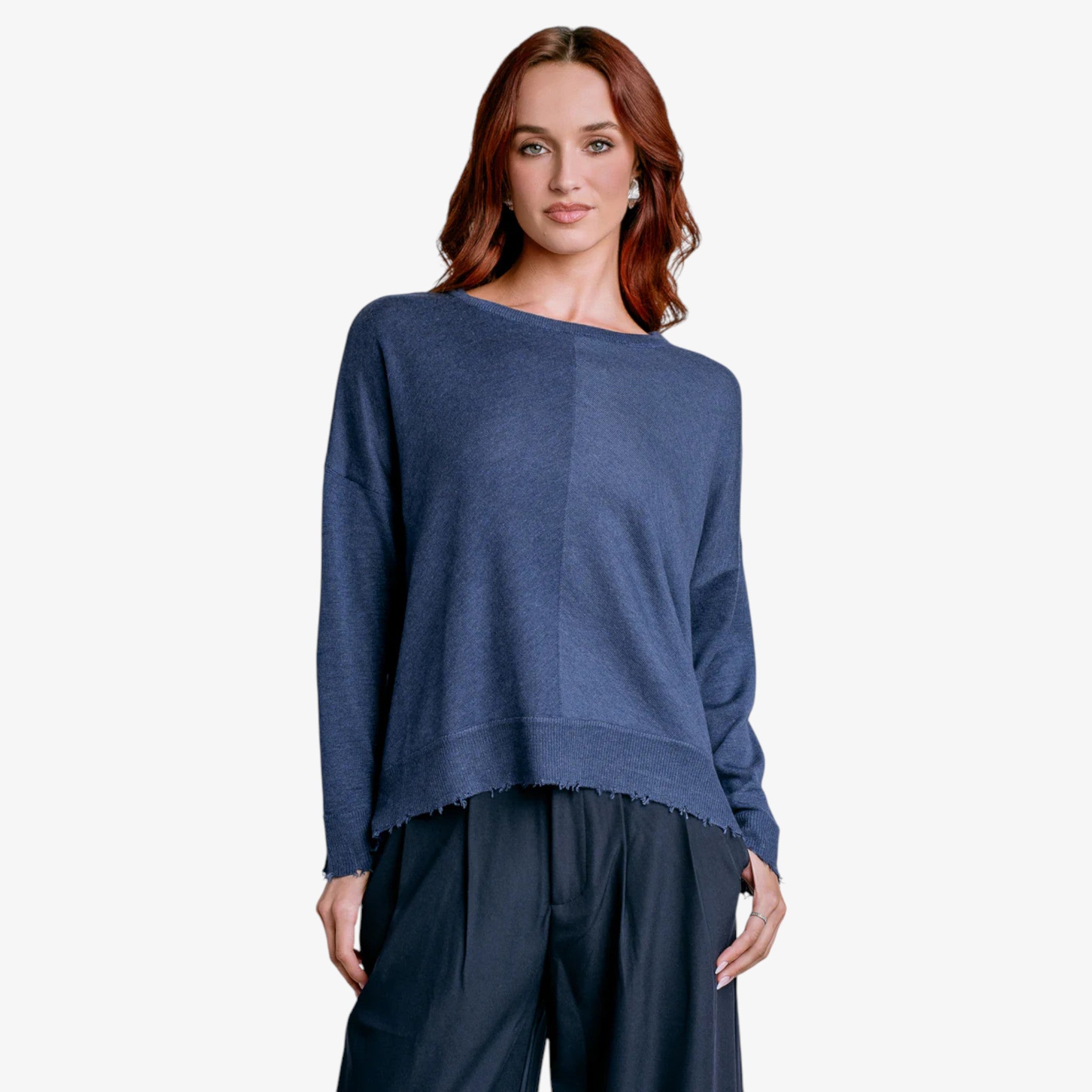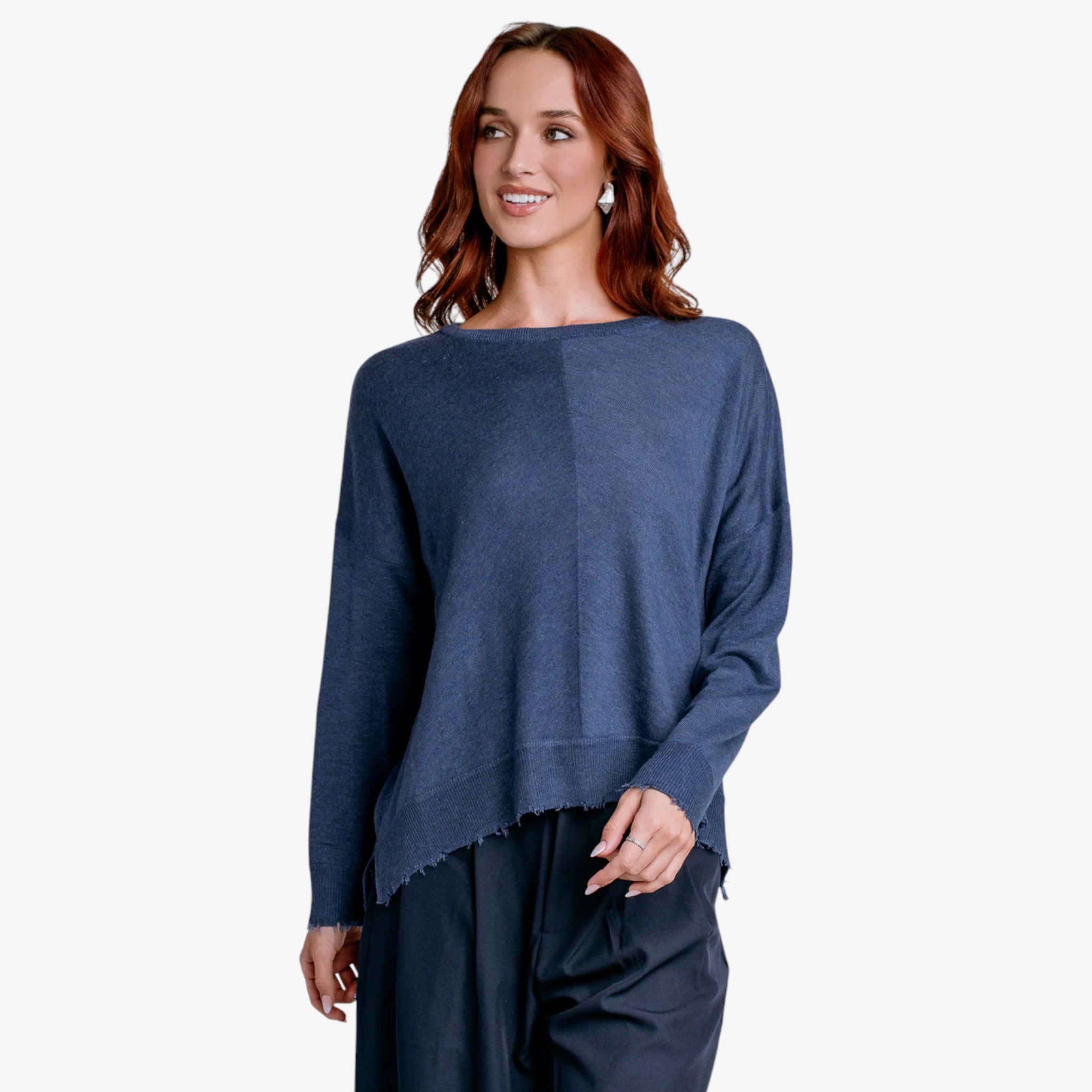 Midnight Blue knit top with a relaxed silhouette and raw-edge hem for an easy, modern look.