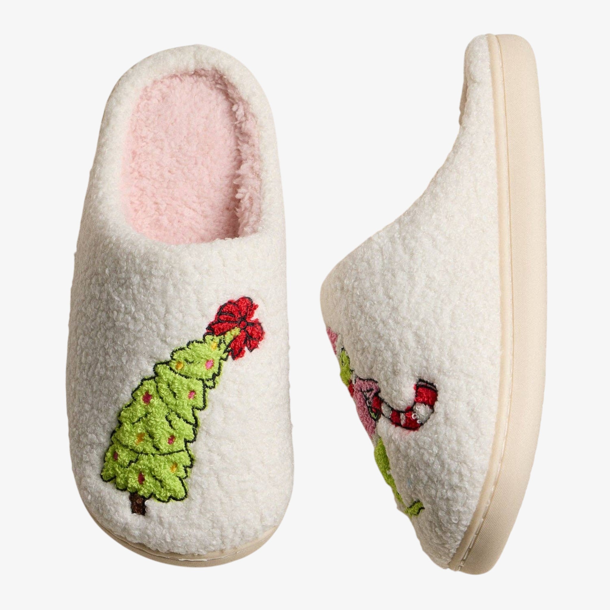 Cozy fuzzy slippers featuring a festive embroidered green character and Christmas tree for a playful holiday touch.